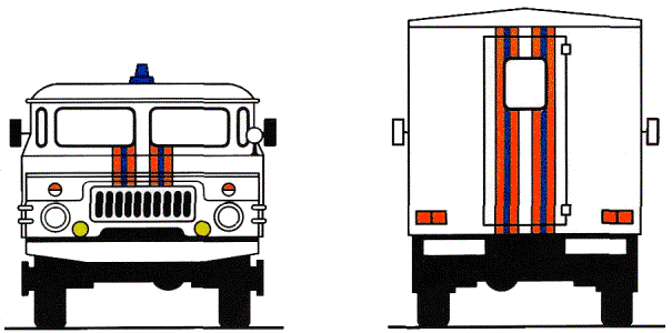 Рисунок А.27 - Цветографические схемы автомобилей служб предотвращения и помощи при чрезвычайных ситуациях и гражданской обороны
