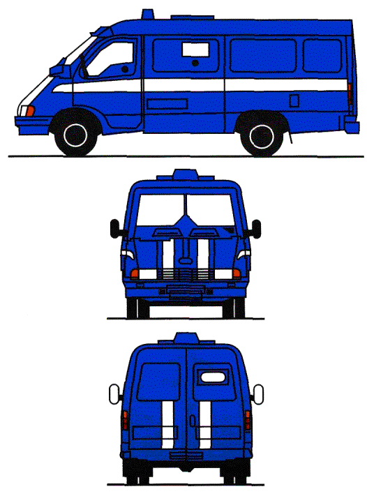 2 Для транспортных средств милиции и Государственной инспекции безопасности дорожного движения допускаются любые цветографические схемы, примеры которых приведены на рисунках А.8 - А.14. При этом правую дверь салона кузова-фургона транспортного средства, изображенного на рисунке А.14, в контрастирующий цвет не окрашивают.