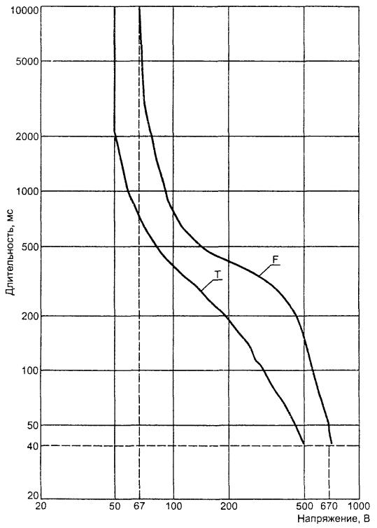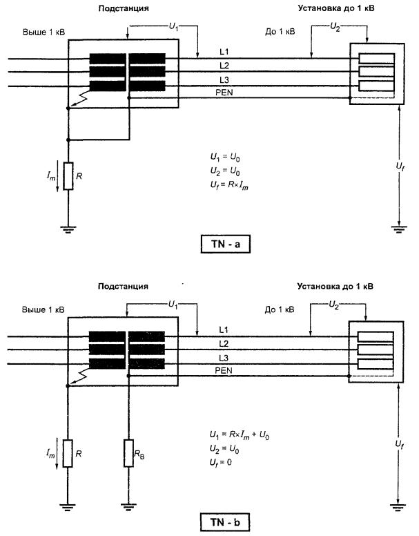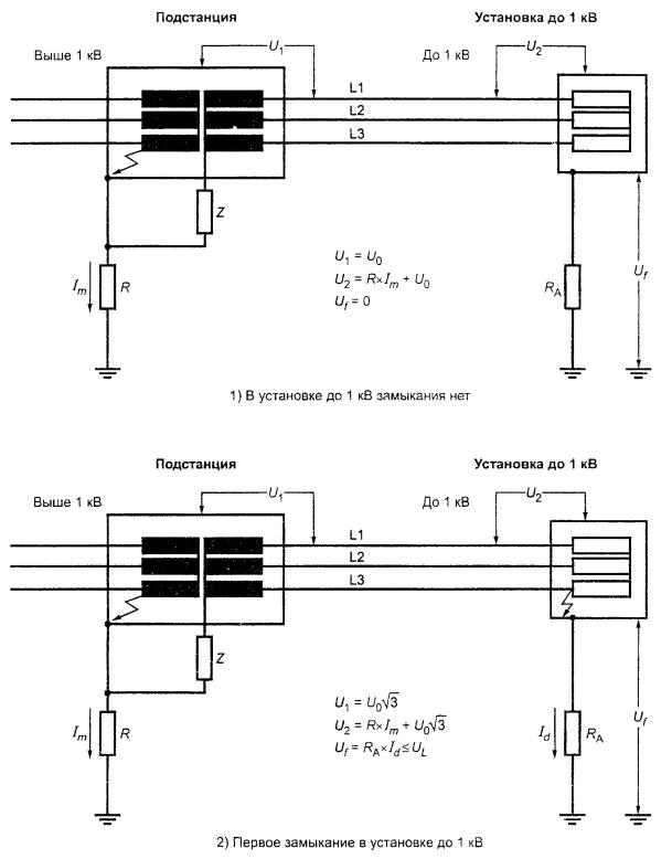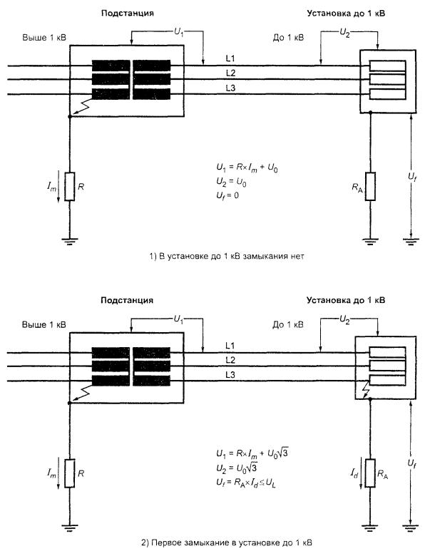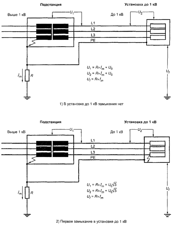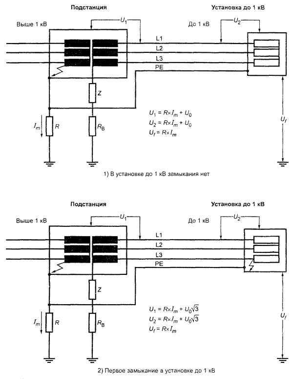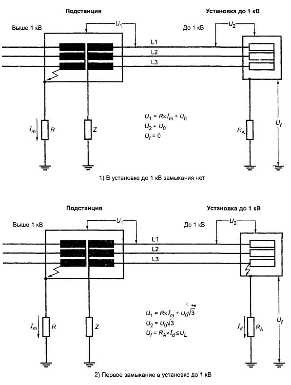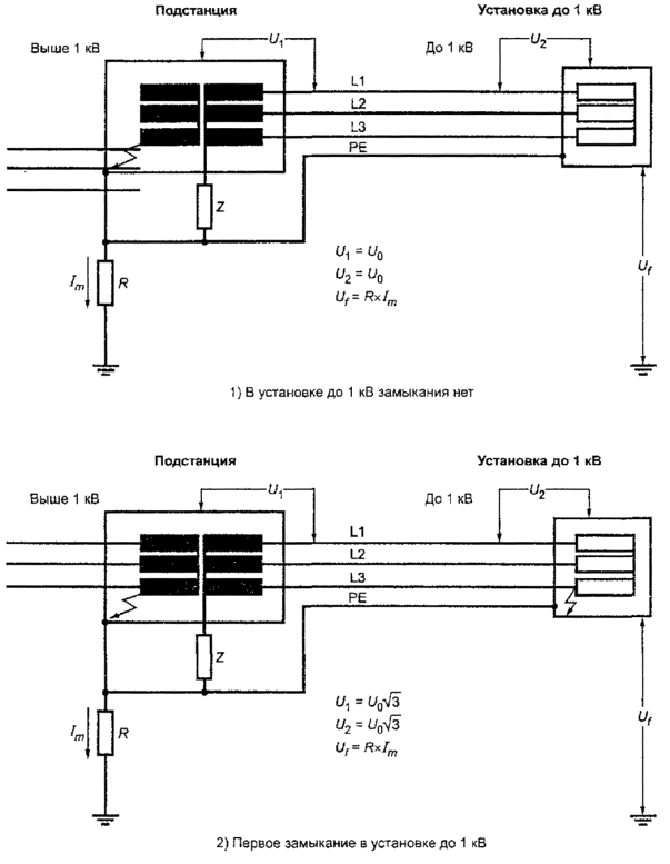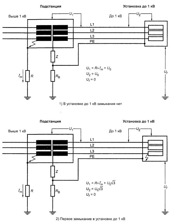 линейное напряжение, которое в Рисунок 44А - Зависимость напряжения замыкания (кривая F) и ожидаемого напряжения прикосновения (кривая Т) от максимальной длительности замыкания на землю на стороне выше 1 кВ Рисунок 44В - TN-системы Рисунок 44С - ТТ-системы Рисунок 44D - IT-системы, пример а) Рисунок 44Е - IT-системы, пример b) Рисунок 44F - IT-системы, пример с1) Рисунок 44G - IT-системы, пример с2) Рисунок 44Н - IT-системы, пример d) Рисунок 44J - IT-системы, пример e1) Рисунок 44К - IT-системы, пример е2) ПРИЛОЖЕНИЕ А(справочное) Пояснения в отношении раздела 442.1 и пунктов 442.1.2, 442.1.3А.442.1 Общие положения Требования этого раздела направлены на обеспечение безопасности людей и защиту оборудования в электроустановке до 1 кВ в случае возникновения замыкания на землю в электроустановке выше 1 кВ. Замыкания между электроустановками напряжений до и выше 1 кВ могут иметь место на трансформаторных подстанциях и их коммутационных устройствах, работающих на напряжении выше 1 кВ. При подобных замыканиях ток протекает через заземляющее устройство, к которому подсоединены все открытые проводящие части подстанции. Значение тока замыкания на землю зависит от полного сопротивления (импеданса) заземления нейтрали, т е. от того, каким образом заземлена нейтраль электроустановки выше 1 кВ (эффективное заземление или заземление через дугогасящие катушки). Ток замыкания, протекающий через заземляющее устройство открытых проводящих частей трансформаторной подстанции, вызывает появление электрического потенциала на этих частях по отношению к земле, и его значение зависит от двух факторов: - значения тока замыкания; - значения сопротивления заземления открытых проводящих частей подстанции Напряжение замыкания может достигать нескольких тысяч вольт и в зависимости от заземляющей системы электроустановки может вызвать. - общее увеличение по отношению к земле электрического потенциала заземляющей системы электроустановки до 1 кВ, который может вызвать пробой электрической изоляции оборудования и тем самым вывести его из строя; - увеличение по отношению к земле электрического потенциала открытых проводящих частей электроустановки до 1 кВ, что может привести к возникновению опасного ожидаемого напряжения прикосновения. Следует помнить, что для ликвидации замыкания на землю в электроустановках выше 1 кВ требуется сравнительно больше времени, нежели в электроустановках до 1 кВ при замыканиях на корпус, поскольку реле устройства защиты настроены на отключение так, чтобы имелось некоторое «время задержки» для автоматического распознавания нежелательных переходных процессов. Кроме того, собственное время срабатывания самого устройства защиты в электроустановках выше 1 кВ также больше по сравнению со временем срабатывания защиты в электроустановке до 1 кВ. Это означает, что результирующая продолжительность напряжения замыкания на землю и продолжительность ожидаемого напряжения прикосновения к открытым проводящим частям электроустановки до 1 кВ может оказаться больше, чем время, установленное правилами для этих электроустановок. Перенапряжения, вызванные замыканиями на землю в электроустановках выше 1 кВ, могут приводить к отказам в работе трансформаторной подстанции на стороне до 1 кВ или к отказам в работе электроустановки до 1 кВ потребителя электроэнергии. Указанные