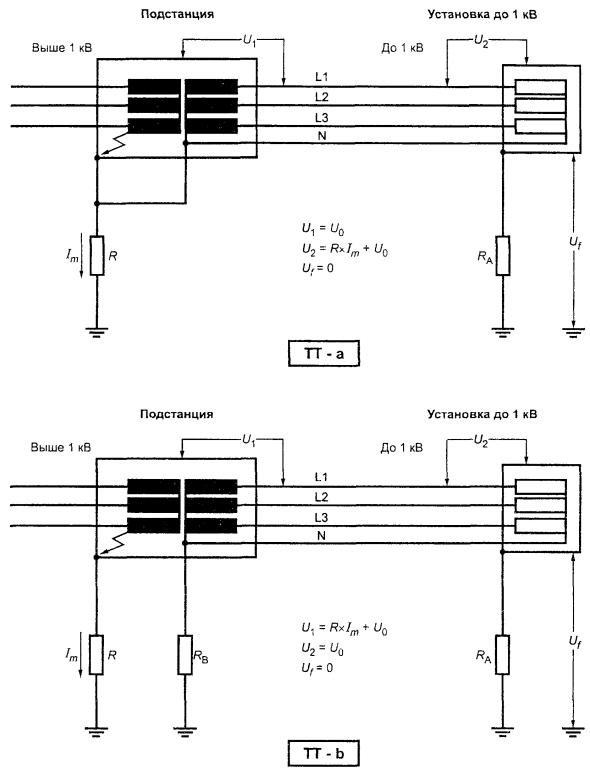 442.2 Заземляющие устройства трансформаторных подстанцийНа трансформаторной подстанции выполняют одно заземляющее устройство, к которому подсоединяют: - заземляющие электроды; - заземляющие проводники; - потенциаловыравнивающие электроды; - корпуса трансформаторов; - металлическую броню кабелей напряжением выше 1 кВ; - металлическую броню кабелей напряжением до 1 кВ, за исключением тех, у которых нейтральный проводник заземлен на независимый заземлитель; - открытые проводящие части оборудования до и выше 1 кВ; - сторонние проводящие части. 442.3 Требования, предъявляемые к заземляющим устройствам трансформаторных подстанцийСчитается общепринятым, что требования, перечисленные в 442.4 и 442.5, будут автоматически выполнены для подстанций с малыми токами замыкания на землю, если имеет место хотя бы одно из условий 442.3.1 и 442.3.2. Если же ни одно из этих условий не выполнено, то необходимо следовать требованиям 442.4 и 442.5. Применительно к электроустановкам сельскохозяйственных и животноводческих помещений, особенно когда речь идет об обеспечении электробезопасности сельскохозяйственных животных, которые по сравнению с человеком более чувствительны к действию электрического тока, необходимо учитывать условия, изложенные в ГОСТ Р 50571.14. 442.3.1 Условия, учитываемые при выполнении заземляющих устройствС позиции обеспечения требований, предъявляемых к заземляющим устройствам трансформаторных подстанций, следует рассматривать следующие возможные варианты отходящих от подстанции кабельных линий, влияющих на общее сопротивление заземляющего устройства подстанции: - один кабель напряжением выше 1 кВ длиной не менее 1 км, металлическая броня которого присоединена к заземляющему устройству трансформаторной подстанции; - то же, напряжением до 1 кВ; - несколько кабелей одного или различных напряжений (до и выше 1 кВ), металлические оболочки которых присоединены к заземляющему устройству трансформаторной подстанции, при условии, что их общая длина не менее 1 км. 442.3.2 Сопротивление заземляющего устройстваНа выполнение требований 442.4 и 442.5 оказывают влияние различные условия, одним из которых является сопротивление естественных заземлителей открытых проводящих частей трансформаторной подстанции, не превышающее 1 Ом. 442.4 Требования, предъявляемые к заземляющим устройствам трансформаторных подстанций, с учетом типов применяемых заземляющих систем442.4.1 Условные обозначенияВ настоящем стандарте приняты следующие условные обозначения: Im - часть тока замыкания на землю в электроустановке выше 1 кВ, который протекает через заземляющее устройство открытых проводящих частей трансформаторной подстанции; Id - часть тока замыкания на землю, который протекает через заземляющее устройство открытых проводящих частей электроустановки до 1 кВ у потребителя электроэнергии; R - сопротивление заземляющего устройства открытых проводящих частей трансформаторной подстанции; RA - сопротивление заземляющего устройства открытых проводящих частей электроустановки до 1 кВ у потребителя электроэнергии; RB - сопротивление независимого заземляющего устройства; Z - полное сопротивление (импеданс) резистора или иных элементов, через которые подсоединяют нейтраль трансформатора к заземляющему устройству; U0 - фазное напряжение между проводами и нейтралью электроус
