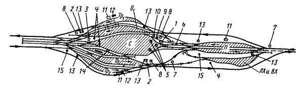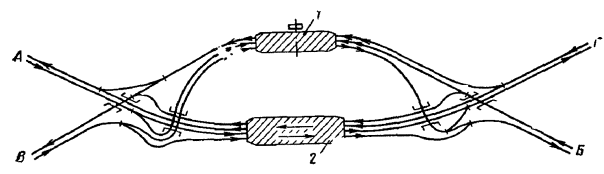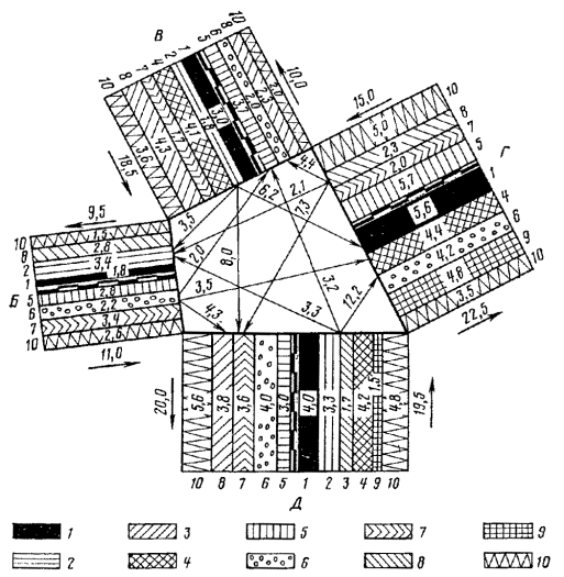 Рис. 2.1. Диаграмма распределения грузовых потоков узла за 19 ... г. по направлениям Б, В, Г, Д (в млн. т):