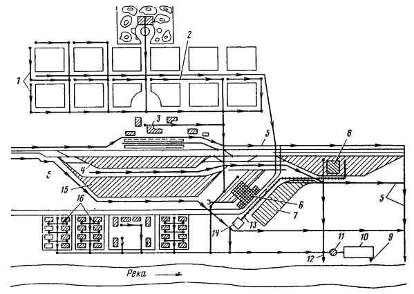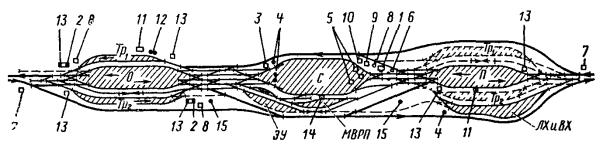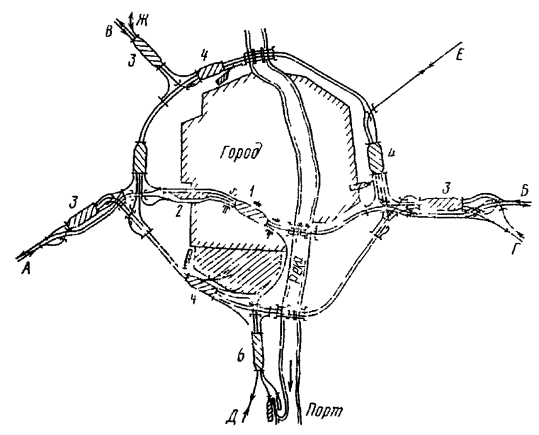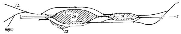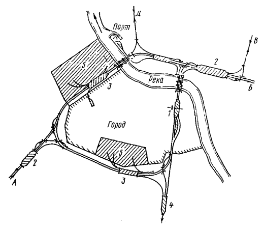 1. Размеры и структура местной грузовой работы и транзитных перевозок узла (станции), а также грузопотоков на его входах и выходах за отчетный период и на расчетные сроки. Эти данные представляют в виде общей диаграммы грузовых потоков (рис. 2.1) и сводной (по основным грузам) таблицы («шахматки») развязки грузопотоков между примыкающими к узлу (станции) направлениями (табл. 2.1*).