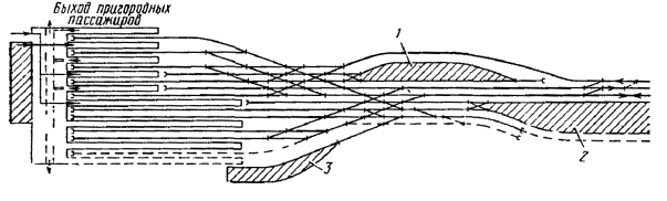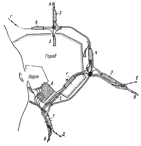 взаимодействие, узла (станции) с другими видами транспорта (водным, автомобильным, трубопроводным, воздушным, городским) по обслуживанию грузовых и пассажирских перевозок;