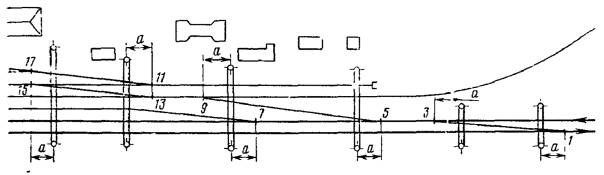 - круговых кривых при углах, кратных углам крестовин (табл. 17.9)