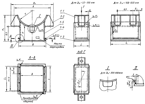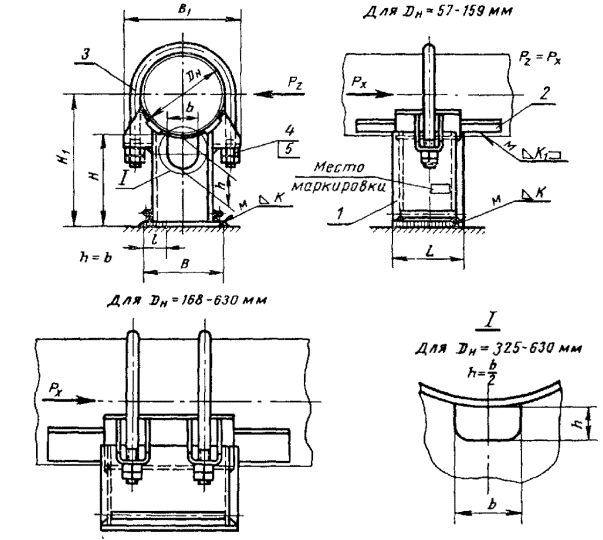 Опоры изготовляются пяти исполнений (в соответствии с температурой рабочей среды трубопровода) согласно табл. 1.