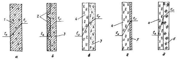 1. ОБЩИЕ ПОЛОЖЕНИЯ1.1. Настоящая инструкция содержит указания по проектированию ограждающих конструкций печей, котлов-утилизаторов и газоходов, данные о свойствах легких жаростойких бетонов и растворов, теплоизоляционных материалов и изделий, применяемых при изготовлении конструкций футеровок. В инструкции приведены основные положения по проектированию и монтажу элементов конструкций, а также ряд требований к производству работ. Под ограждающими конструкциями печей понимается однослойная или многослойная футеровка с металлическим кожухом. 1.2. Инструкция содержит указания по расчету и конструированию ограждающих конструкций стен и сводов агрегатов из бетонных и железобетонных панелей, изделий из волокнистых огнеупорных материалов и облегченных футеровочных панелей. Отдельные участки сложной конфигурации и места прохода труб и змеевиков через футеровку можно выполнять монолитными - торкретированием или бетонированием. В инструкции приводятся данные о легких жаростойких бетонах, волокнистых огнеупорных материалах для рабочего слоя футеровки, облегченных футеровочных панелях и теплоизоляционных материалах, используемых для теплоизоляционных слоев. В зависимости от условий применения и свойств материалов (предельно допустимая температура применения, способ выполнения, толщина) футеровки выполняют однослойными (рис. 1, а), с теплоизоляционными вкладышами (рис. 1, б) и многослойными (рис. 1, в, г, д).