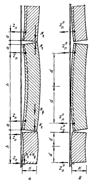 где Zn - усилие, возникающее в креплении панели, ктс; Mt - определяемый no CH 482-76 температурный момент в закрепленной панели, кгс . м; a - расстояние от крепления панели до ее края, м. Рис. 2. Схема усилий в футеровке: а - при нагревании; б - при охлаждении При расчете деформаций для определения усилий при tr = 250 °С принимается треугольная эпюра температуры по сечению панелей. Усилия, возникающие в креплениях панелей при остывании (рис. 2, б) определяют по формуле: