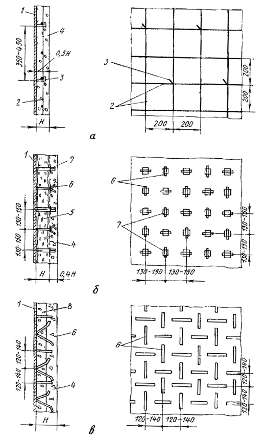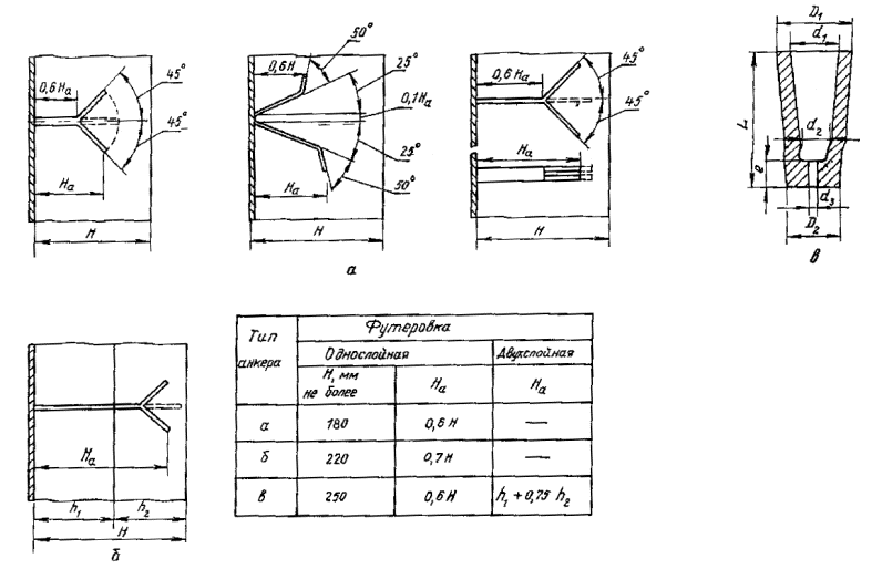Нагрузки от собственной массы теплоизоляционных изделий следует принимать с учетом влажности материалов после изготовления, указанной в соответствующих нормативах (см. табл. 5). 4.10. В случае возможного увлажнения теплоизоляционных слоев панелей в период транспортирования монтажа, необходимо учитывать увеличение массы этих материалов путем умножения ее на коэффициент 2,0. 4.11. При расчете бетонных панелей с металлическим основанием бетон учитывают только в сжатой зоне сечения. Поэтому места захватов при подъеме и монтаже и подкладок при транспортировании должны быть расположены таким образом, чтобы в бетоне панели с неармированной стороны не возникали растягивающие напряжения. Конструирование элементов футеровокВ ограждающих конструкциях из легких жаростойких бетонов и теплоизоляционных материалов футеровка выполняет только теплозащитные функции. 4.13. Выбор состава, приготовление, укладку и контроль качества жаростойких бетонов, заполнителей и тонкомолотых добавок производить согласно СНиП II-21-75 ("Бетоны на неорганических вяжущих и заполнителях"), СНиП 1-Г.10-62 ("Заполнители для бетона и растворов") и "Инструкции по технологии приготовления жаростойких бетонов" СН 156-79. 4.14. Арматурные каркасы, сетки и анкеры следует изготовлять в соответствии со СНиП II-21-75, металлические элементы конструкций футеровки - со СНиП III-48-75. Сварку арматуры и анкеров выполняют согласно "Указаниям по сварке соединений арматуры и закладных деталей железобетонных конструкций" СН-393-69; приварку анкеров из жаростойкой стали к металлическому основанию - в соответствии с ОСТ 26-01-10-70 "Электроды для ручной электродуговой сварки". 4.15. В рабочих чертежах и технических условиях на изделия и элементы конструкций из легкого жаростойкого бетона необходимо указывать вид бетона и его характеристики (проектную марку по прочности, прочность и влажность при отпуске с завода и объемную массу в высушенном состоянии, допуски на геометрические размеры панелей и объемную массу бетона панелей). Кроме того, необходимо указывать вид, класс и марку стали для арматуры и закладных деталей. 4.16. В зависимости от конструктивного решения ограждений промышленных печей, расположения в них форсунок и особенностей монтажа панели могут иметь металлическое основание или футеровку, выполненную по сплошному металлическому кожуху. 4.17. Толщина футеровки панелей (однослойных и многослойных) не должна превышать 250 мм. В пределах одного теплового агрегата с изменением температуры, скоростей движения газов и других условий службы экономически целесообразно изменять конструкцию и толщину футеровки. 4.18. Размеры панелей следует устанавливать, исходя из обеспечения прочности при изготовлении и транспортировании, удобства монтажа при возведении и ремонте, а также из условий унификации. Максимальные размеры железобетонных панелей с каркасом из уголков - 1,5 х 2,0 м, панелей с металлическими основаниями - 2,5 х 3,0 м. Большие размеры можно принимать при надлежащем обосновании и опытной проверке. 4.19. Размеры теплоизоляционных изделий для теплоизоляционных слоев и вкладышей назначают с учетом расстояния между анкерами. Рис. 4. Конструкции анкеров: а, б и в - металлические анкеры для однослойных футеровок; г - металлические анкеры для многослойных футеровок; д - керамические анкеры для однослойны