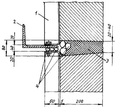 При армировании элементов конструкций из легкого жаростойкого бетона сетками или каркасами их следует выполнять сварными. 4.22. Для организованного развития и уменьшения величины раскрытия усадочных трещин со стороны рабочего пространства печи в бетоне следует предусматривать усадочные швы шириной 3 мм и глубиной 30 мм при толщине слоя бетона 150 - 250 мм и 20 мм при толщине 150 мм. Расстояние между швами в горизонтальном и вертикальном направлениях должно составлять 600 - 900 мм. 4.23. Монтажные петли в панелях с металлическим основанием и в панелях с каркасом из уголков приваривают соответственно к основанию или каркасу. Для удобства монтажа петли следует располагать ближе к центру тяжести панели. 4.24. Очертания торцевых поверхностей панелей должны предотвращать выпадение раствора и теплоизоляционных материалов из шва (рис. 5). Для этого стык между панелями предусматривают сужающимся в сторону более нагретой поверхности либо выполняют пазы в торцевых поверхностях панелей. Ширина стыка между панелями составляет 20 - 40 мм. Рис. 5. Стыки панелей из легкого жаростойкого бетона: 1 - панели из легкого жаростойкого бетона; 2 - легкий жаростойкий раствор; 3 - легкий жаростойкий раствор или вата высокоглиноземистого состава; 4 - плитная изоляция на основе высокоглиноземистого волокна 4.25. Элементы технологического оборудования, проходящие сквозь футеровку (штуцеры, патрубки и пр.), крепят к кожуху печи или металлическому основанию панелей. 4.26. При конструировании металлического кожуха ограждений необходимо обеспечить компенсацию его температурных деформаций. 4.27. Шаг анкеров в однослойных бетонных панелях принимают в зависимости от толщины слоя бетона согласно данным, приведенным ниже.