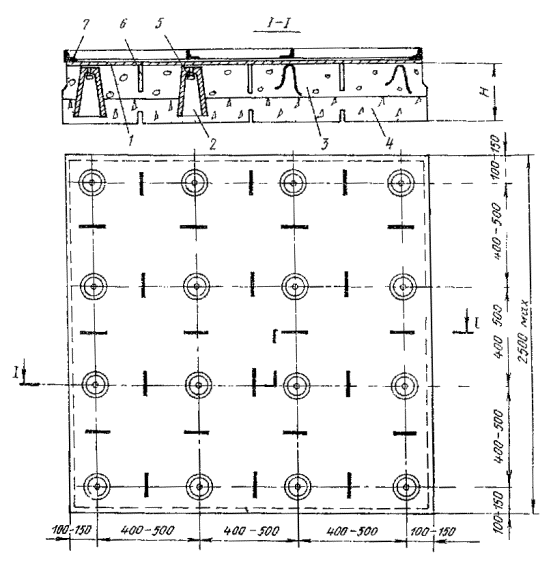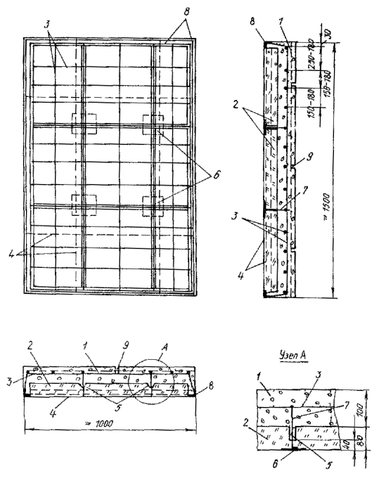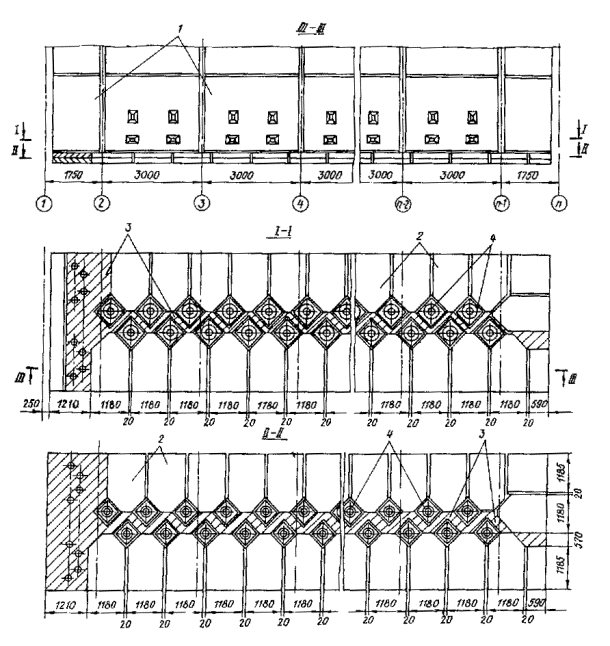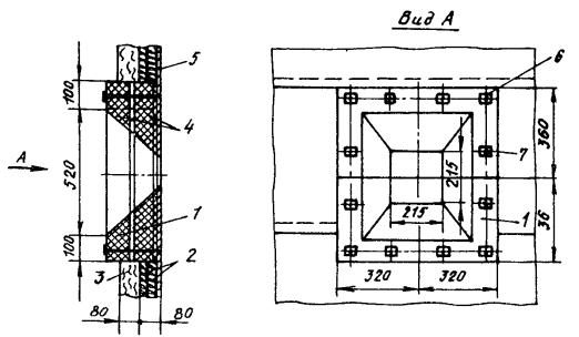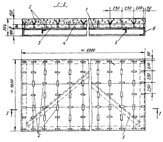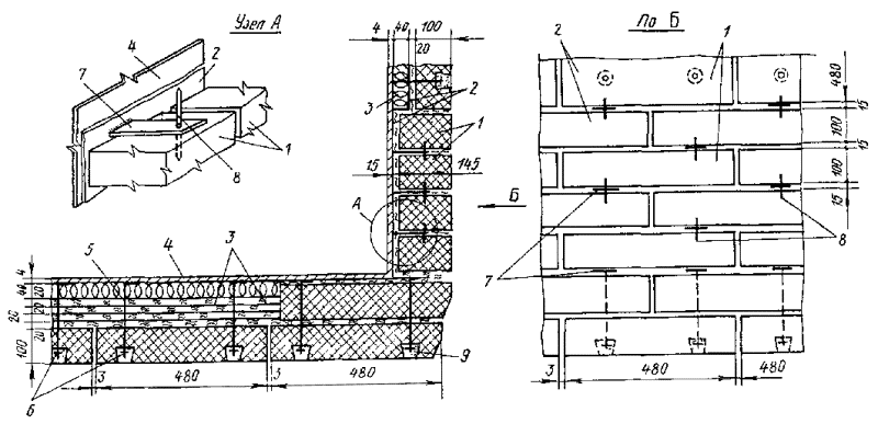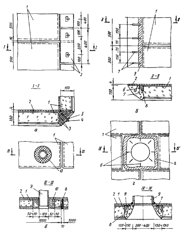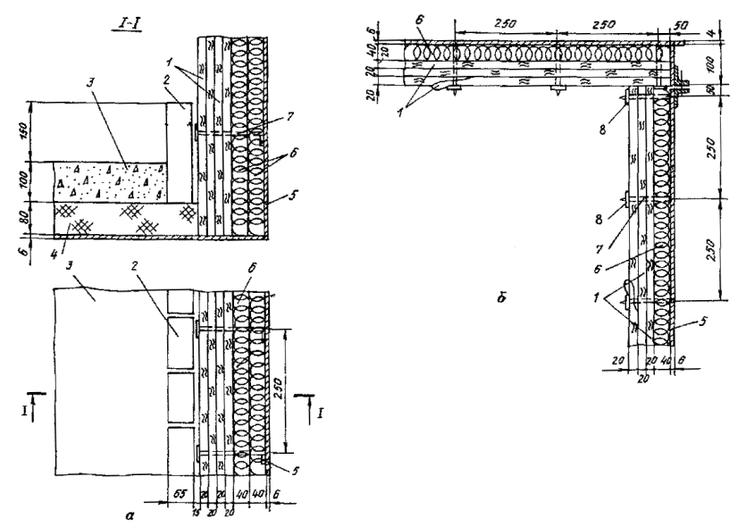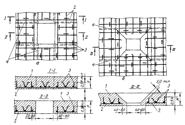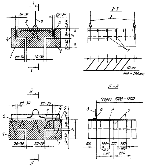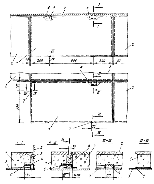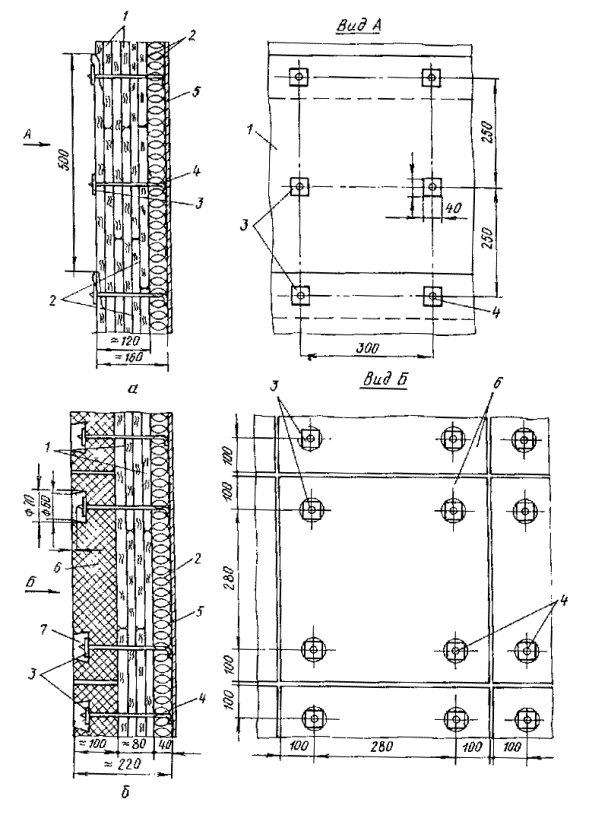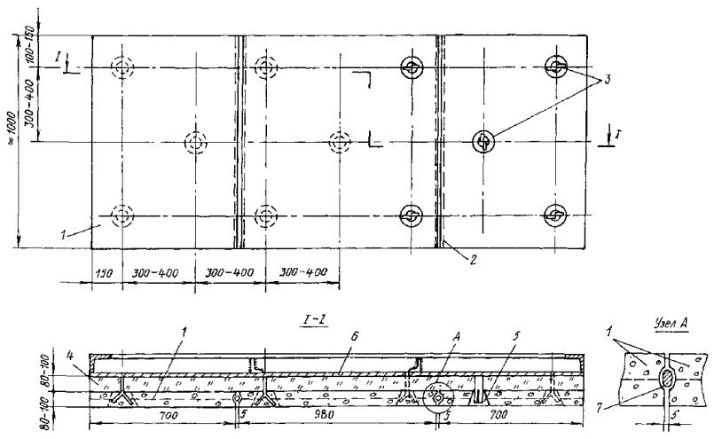 Пример конструирования панелей с металлическим основанием приведен на рис. 6. Рис. 6. Панель из легкого жаростойкого бетона с металлическим основанием: а - однослойная; б - с теплоизоляционными вкладышами 4.28. Металлическое основание для соединения панелей между собой и крепления к элементам каркаса агрегата должно иметь по периметру отогнутые борта или уголки (рис. 7). Высоту бортов или уголков определяют расчетом на прочность в стадиях изготовления, транспортирования и монтажа; она не должна быть менее 50 мм. В бортах выполняют отверстия диаметром 12 - 16 мм для крепления панелей. Для увеличения жесткости панелей уголки целесообразно приваривать на перо. 4.29. Металлические основания размером более 1,2 х 1,2 м должны быть усилены дополнительными уголками. Сечение уголков принимают по расчету согласно п. 4.12 настоящей инструкции, но не менее 50 х 5 мм; расстояние между уголками не более 1,0 м. Рис. 7. Стык панелей и их крепление к каркасу: 1 - металлическое основание панелей; 2 - уголок каркаса; 3 - растворный шов; 4 - шнуровой асбест 4.30. Тип и размеры анкеров, применяемых для соединения слоев в панелях, принимают в зависимости от толщины слоев и температуры нагрева. Керамические анкеры крепят к металлическому основанию с помощью шпилек из жаростойкой стали, диаметр которых должен быть на 2 мм меньше диаметра отверстия в анкере. Теплоизоляционный слой бетона в панелях с керамическими анкерами соединяют с металлическим основанием керамическими анкерами, а также с помощью стальных анкеров. Марку стали анкеров принимают в зависимости от температуры их нагрева. Шаг керамических и стальных анкеров 250 - 500 мм в обоих направлениях. Примеры конструирования многослойных панелей приведены на рис. 8 и 9. 4.31. Анкеры из жаростойкой стали приваривают к металлическому основанию в соответствии с ОСТ 26-01-10-70 "Электроды для ручной электродуговой сварки", разработанным НИИхиммаш. Рис. 8. Конструкция панели из легкого жаростойкого бетона со слоем теплоизоляции: 1 - металлическое основание; 2 - анкеры из жаростойкой стали; 3 - теплоизоляционные изделия; 4 - легкий жаростойкий бетон; 5 - уголки жесткости; 6 - швеллер Рис. 9. Конструкция панели, собираемой из готовых элементов: 1 - плита из легкого жаростойкого железобетона; 2 - шов между плитами; 3 - анкеры из жаростойкой стали; 4 - плитная теплоизоляция; 5 - отверстия в бетонной плите; 6 - металлическое основание; 7 - шнур из асбеста или каолиновой ваты 4.32. В конструкции ограждения, выполняемой из железобетонных панелей (рис. 10), металлический кожух воспринимает нагрузку от массы панелей и температурных усилий. Для уменьшения ширины раскрытия трещин на более нагретой поверхности панелей в охлажденном состоянии рабочую высоту сечения панелей принимают такой, чтобы температура арматуры ta в стационарном тепловом режиме составляла при ограничении продольных удлинений панелей и возникновении продольного сжимающего усилия: при свободном удлинении панелей: где tr - температура более нагретой поверхности панелей, °С αat - коэффициент температурного расширения арматуры при температуре ta. Температура арматуры, удовлетворяющая условиям (13) и (14), не должна быть более 300 °С. 4.33. Панели с каркасом из уголка армируют сеткой с анкерами. Сетку приваривают к полке уголка любым способом, обеспечивающим создание защитного слоя. Анкеры диаметром 5 - 6 мм и