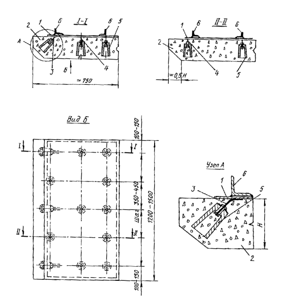 где n - коэффициент перегрузки, учитывающий колебания объемной массы и принимаемый равным 1,2; j - количество слоев в панели; Vj - объем материала слоя j, м3; γ0j - объемная масса слоя j, кг/м3; k - количество анкеров в панели, воспринимающих нагрузку от массы футеровки; для панелей с прямоугольными анкерами за k принимают количество анкеров, большая сторона которых расположена вертикально. При расчете анкеров с отгибами по сечению в уровне менее нагретой поверхности бетона (сечение Б - Б на рис. 3) каждый отгиб рассчитывают на нагрузку, равную 0,5Р, с учетом соответствующей высоты сечения отгиба. Нагрузку на один анкер определяют по формуле: