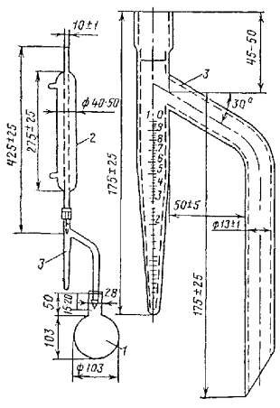 где v1 - количество 0,5Н раствора КОН, израсходованное на титрование рабочей пробы, мл; v2 - количество того же раствора КОН, израсходованное на титрование слепого опыта, мл; Tкон - титр 0,5Н. раствора КОН, мг, g - навеска эмульгатора, г; В - содержание воды в эмульгаторе, %. Значения v1 и v2 устанавливают расчетным или графическим интерполированием для рН - 10. Титр КОН устанавливают потенциометрически по спиртовому раствору 0,5Н HCl приготовленному из фиксанала. При применении экспресс-метода полоску индикаторной бумаги погружают в испытуемый раствор, вынимают из него и немедленно сравнивают полученную окраску бумаги с прилагаемой шкалой цветности, соответствующей различным значениям рН (от 1 до 14). Для определения рН потенциометром используют приборы различных конструкций. Измерения выполняют в соответствии с инструкциями, прилагаемыми к приборам. 4.5. Определение содержания фенолов в дегтях. Из испытуемого дегтя путем разгонки выделяют фракцию, выкипающую при 170 - 270°С. Объем 10 %-ного раствора едкого натра, примерно равный объему этой фракции, взвешивают в чистом сухом стакане и подогревают на водяной бане до 50°С. Приемник с фракцией также подогревают на водяной бане до 50°С. В чистую сухую делительную воронку выливают подогретый едкий натр и фракцию, энергично встряхивают в течение 5 мин и устанавливают в сушильный шкаф, имеющий температуру 50°С. Стаканы из-под едкого натра и фракции взвешивают с точностью 0,01 г и пo разности находят массы едкого натра Рщ и фракции Р, взятые для анализа. После четкого разделения слоев воронку вынимают, сливают нижний слой фенолятов в тарированный стакан и взвешивают. Содержание фенолов (в % по массе) находят по формуле