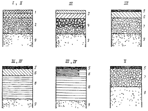 Примечания. 1. Модули упругости позиций 1 - 5 даны для материалов, обработанных вяжущим в установке; для соответствующих материалов, обработанных вяжущим на дороге, модули упругости должны быть снижены на 20 %. 2. Модули упругости грунтов, т.е. материалов, применяемых без переработки и обогащения гранулометрическими добавками, см. «Инструкцию по применению грунтов, укрепленных вяжущими материалами, для устройства оснований и покрытий автомобильных дорог и аэродромов» (СН 25-74). Рис. 2. Схемы конструкций дорожных одежд для I - V категорий дорог, устраиваемых с применением эмульсий: 1 - двухслойное покрытие из горячего асфальтобетона; 2 - основание из эмульсионно-минеральной смеси; 3 - двухслойное покрытие из эмульсионно-минеральной смеси (верхний слой из плотной смеси, нижний - из пористой); 4 - основание из щебня с пропиткой эмульсией на глубину 6 - 8 см; 5 - поверхностная обработка с эмульсией; 6 - покрытие из эмульсионно-минеральной смеси: 7 - основание из щебня, обработанного эмульсией; 8 - покрытие или основание из гравийно-песчаной или песчаной смесей, обработанных битумной эмульсией и цементом; 9 - подстилающий песчаный слой УСТРОЙСТВО ДОРОЖНЫХ ОДЕЖД ИЗ ЭМУЛЬСИОННО-МИНЕРАЛЬНЫХ СМЕСЕЙ, ПРИГОТОВЛЕННЫХ В УСТАНОВКЕ5.3. Область применения эмульсионно-минеральных смесей в конструктивных слоях дорожных одежд в основном та же, что и аналогичных им битумоминеральных смесей, приготовленных горячим способом. Особые случаи применения некоторых разновидностей эмульсионно-минеральных смесей оговорены в соответствующих разделах Технических указаний. 5.4. Эмульсионно-минеральные смеси отличаются от горячих битумоминеральных более длительным сроком формирования, зависящим от погодно-климатических факторов, что обусловливает наличие особенностей в технологии работ, необходимых для обеспечения качества и несущей способности конструкций, выполненных с применением эмульсий. ЧЕРНЫЙ ЩЕБЕНЬ 5.5. Щебень, обработанный эмульсией, можно использовать непосредственно после приготовления или заготавливать впрок, т.е. хранить в штабелях. Такой способ не только устраняет зависимость строительных объектов от смесительной установки, но и ускоряет процесс формирования конструктивных слоев благодаря формированию пленки вяжущего на щебне в период хранения. 5.6. Щебень применяют как основных, так и кислых пород рядовой или определенной фракции. Содержание в щебне пылевидных, илистых или глинистых частиц должно соответствовать СНиП 1-Д. 2-70. 5.7. Для обработки щебня применяют среднераспадающиеся анионные и катионные, а также обратные эмульсии вязкие ЭО-В и жидкие ЭО в сочетании с прямыми марок СА и МА-1. 5.8. Эмульсии, используемые для обработки щебня, должны выдерживать испытание на водоустойчивость пленки по п. 4.13 для прямых эмульсий и по п. 4.23 - для обратных. Если прямая эмульсия не выдерживает испытания, в щебень необходимо вводить 0,5 % извести от массы щебня. 5.9. При обработке щебня, предназначенного для укладки сразу после приготовления, используют эмульсии, содержащие битум марок БНД-40/60, БНД-60/90 или БНД-90/130. Для щебня, заготавливаемого впрок, применяют прямые эмульсии, приготовленные на битумах пониженной вязкости (с глубиной проникания иглы 200 - 250), обратные ЭО-В и ЭО в сочетании с прямыми СА и МА-1, приготавливаемыми на битумах марок БНД-40/60 и БНД-60/90. Битумы с глубино