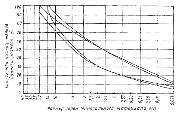 Предварительно промытый щебень в количестве 70 % нормы (см. табл. 16) рассыпают по слою эмульсии самоходным распределителем Д-708А, автомобилем-самосвалом с навесным приспособлением или другим механизмом, обеспечивающим равномерное распределение щебня. Механизм, распределяющий щебень, должен двигаться не далее 20 м от автогудронатора и рассыпать щебень перед собой, наезжая колесами на щебень, а не на слой эмульсии. Сразу после распределения щебня разливают остальное количество эмульсии (70 % нормы), Затем распределяют оставшийся щебень (30 % нормы). Слой поверхностной обработки уплотняют за 3 - 4 прохода легкого (5 т) катка с металлическими вальцами, приурочивая эту операцию к началу распада эмульсии. Более тяжелые катки (10 т) допускаются только при использовании очень прочного щебня, например базальтового. Рекомендуются катки на пневматических шинах. 5.102. При использовании анионных эмульсий движение транспортных средств по поверхностной обработке закрывают на сутки для формирования слоя, а при катионных эмульсиях движение не закрывается, но в течение 1 - 2 сут ограничивают скорость 40 км/ч. 5.103. Слои с шероховатостью типа наждачной бумаги толщиной 3 - 8 мм устраивают из песчаных эмульсионно-минеральных смесей пластичной консистенции (литых), чтобы придать покрытиям шероховатость и меньшую водопроницаемость. Для этого вида работ могут быть использованы катионные и анионные эмульсии или пасты. Приводимые ниже рекомендации касаются лишь смесей с пастами, называемыми шламами, приготовление и применение которых легко осуществимо при использовании машин серийного выпуска и дополнительных несложных приспособлений. 5.104 Слои износа из шламов устраивают на дорогах III - V категорий в III - V дорожно-климатических зонах. 5.105 Для приготовления шламов применяют смесь природного и дробленого песков в соотношении 1:1. В качестве дробленого песка целесообразно использовать фракцию 0 - 5 мм, полученную при дроблении изверженных горных пород прочностью не ниже 1000 кгс/см2. В смесь необходимо добавлять минеральный порошок в таком количестве, чтобы общее содержание частиц мельче 0,071 мм составляло 10 - 15 %. Если эмульгатором для приготовления пасты служит фильтрпрессная грязь, то ее относят к частицам мельче 0,071 мм и соответственно уменьшают количество минерального порошка в смеси. Зерновой состав минеральной части шламов подбирают по принципу плотных песчаных смесей (рис. 6). Рис 6 Кривые зернового состава песчаных эмульсионно-минеральных смесей для слоев износа 5.106 Ориентировочно шламы имеют следующий состав: 20 - 30 % пасты, 40 - 50 % песка (смесь природного и дробленого), 5 - 10 % минерального порошка, 15 - 20 % воды. 5.107. Шламы приготовляют двумя способами. По первому способу применяют заранее приготовленную битумную пасту. В этом случае для приготовления смесей могут быть использованы смесители принудительного и свободного перемешивания. В смеситель при непрерывном перемешивании подают сперва минеральные материалы и воду, а затем пасту. По второму способу в смесителе сначала приготовляют пасту в соответствии с п. 3.46, затем, не выгружая пасты, в нее вводят минеральные материалы, и воду. В этом случае пригодны лишь смесители принудительного действия со скоростью вращения лопастей не менее 40 об/мин. Готовые смеси выгружают в автомобили-самосвалы при дальности возки н