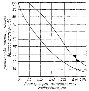 рассчитывают по формуле 5.11. Щебень обрабатывают в смесителях принудительного действия, обеспечивающих дозирование всех компонентов. При обработке прямой эмульсией сначала в смеситель подают щебень и известь (если это требуется для улучшения водоустойчивости пленки вяжущего), перемешивают до равномерного распределения извести по поверхности щебня, затем вводят эмульсию. При обработке обратной вязкой эмульсией щебень сначала обязательно перемешивают с известью, затем с обратной эмульсией. Если обрабатывают щебень двумя эмульсиями, сначала его перемешивают с известью, затем с обратной эмульсией и наконец с прямой. При работе с прямыми или с обратными жидкими эмульсиями ЭО в сочетании с прямыми, как правило, не требуется подогрева минеральных материалов и эмульсии. Обратную эмульсию вязкую ЭО-В нагревают до 60 - 70°С, а обрабатываемый ею щебень до 20 - 60°С. 5.12. Готовую смесь выгружают в автомобили-самосвалы и отвозят к месту складирования или на строительный объект. Местом складирования черного щебня может служить открытая, тщательно спланированная бульдозером площадка. Во избежание загрязнения щебня грунтом и для обеспечения дренажа воды, вытекающей из смеси в процессе ее формирования, и дождевой воды, площадку засыпают слоем песка толщиной в несколько сантиметров. Смесь укладывают в штабель, высоту и объем которого устанавливают исходя из производительности смесительной установки, размеров площадки, предполагаемых сроков хранения. 5.13. Щебень, обработанный эмульсией, может храниться в штабеле, не слеживаясь несколько месяцев. Образующаяся со временем корка плотного материала не препятствует разработке штабеля. В процессе разработки и погрузки она разрыхляется. Черный щебень погружают экскаватором или погрузчиком, транспортируют к месту работ автомобилями-самосвалами. 5.14. Черный щебень укладывают асфальтоукладчиком или автогрейдером в соответствии с «Инструкцией по устройству покрытий и оснований из щебня (гравия), обработанного органическими вяжущими» (ВСН 123-65). Работы по укладке черного щебня из штабеля в конструктивный слой можно выполнять при температуре воздуха 0 - 5°С. Свежеприготовленный щебень, обработанный анионной эмульсией, укладывают в конструктивный слой при температуре воздуха не ниже 10, катионной - не ниже 5, обратной совместно с прямой пли одной обратной до -5°С. 5.15. Для уплотнения, которое начинают сразу после распределения черного щебня, применяют средние и тяжелые катки как с металлическими вальцами, так и на пневматических шинах. Если при уплотнении щебень прилипает к катку, поверхность укладываемого слоя нужно присыпать небольшим количеством песка. 5.16. Если по устроенному конструктивному слою сразу открывают движение транспортных средств, поверхность материала в процессе уплотнения необходимо присыпать песком из расчета 3 - 5 кг/м2. 5.17. При стадийном строительстве слои из щебня, обработанного эмульсией, могут служить покрытиями при условии устройства на них поверхностной обработки. ПОРИСТЫЕ ЩЕБЕНОЧНЫЕ СМЕСИ 5.18. Рекомендуемый зерновой состав пористых щебеночных смесей, полученных дроблением горной породы без последующего разделения на фракции или составленных из щебня различных фракций и отсева продуктов дробления или природного песка приведен на рис. 3. Рис. 3. Кривые зернового состав