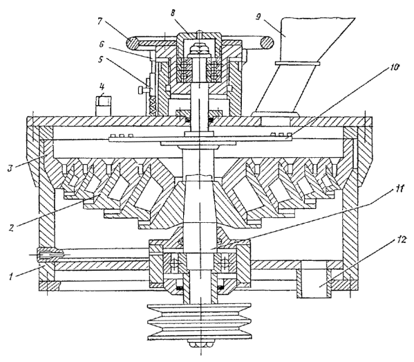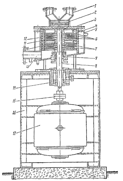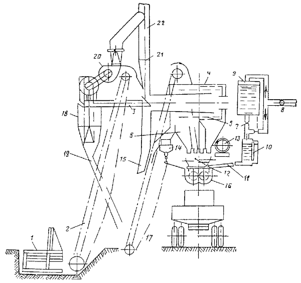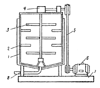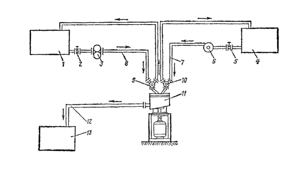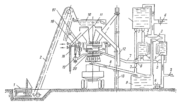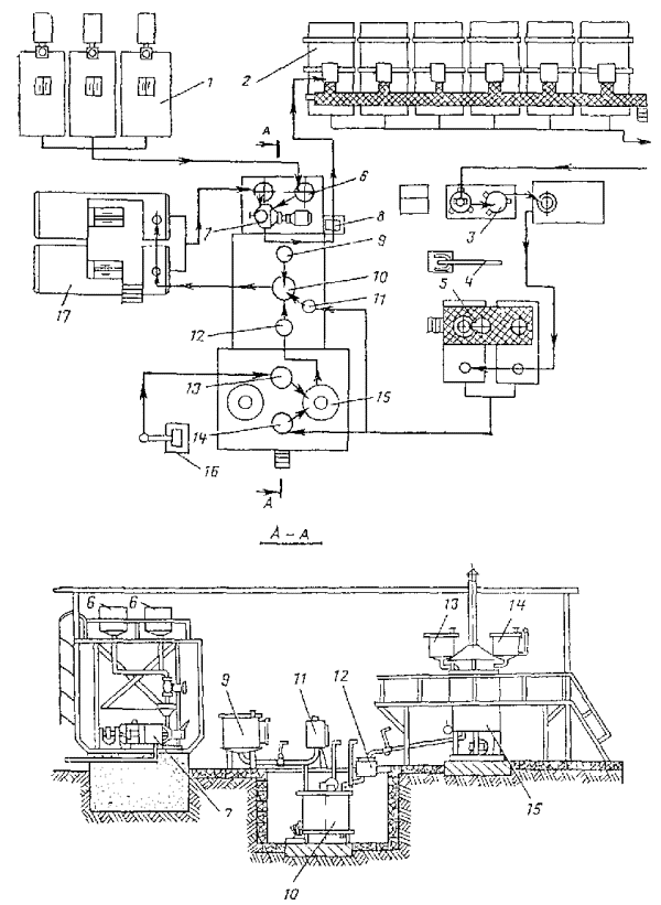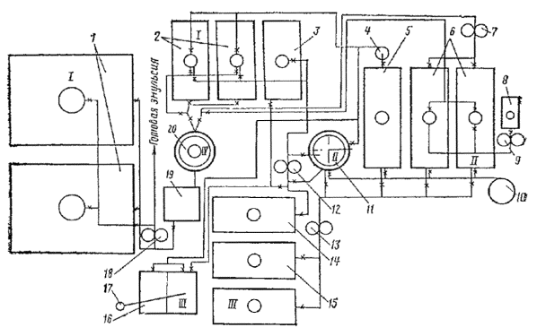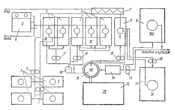 Стационарная эмульсионная установка: 1 - насос для периодической перекачки госсиполовой смолы; 2 - емкости для хранения госсиполовой смолы; 3 - насос для постоянной подачи госсиполовой смолы в битум; 4 - бак для выпаривания и приготовления раствора едкого натра; 5 - котлы для варки мыла; 6 - котлы для приготовления водного раствора эмульгатора; 7 - испаритель для госсиполовой смолы; 8 - емкость для хранения эмульсии; 9 - котел для подготовки (смешение госсиполовой смолы с битумом); 10 - насос для подачи битума; 11 - битумохранилище; 12 - кабина управления; 13 - насос для откачки эмульсии; 14 - промежуточный бак; 15 - насос для перемешивания битума; 16 - насос для перемешивания водного раствора эмульгатора; 17 - насос для перемешивания мыла; 18 - насос для подачи раствора эмульгатора; 19 - диспергатор Узел I - для приема и хранения госсиполовой смолы состоит из четырех заглубленных в землю металлических цистерн объемом по 25 м3 каждая. Они связаны между собой системой трубопроводов, к которым подключены два насоса: один - большей производительности, служит для периодической подачи госсиполовой смолы при варке мыла, другой - малой производительности, непрерывно подает госсиполовую смолу для растворения, в битуме. Цистерны оборудованы паровыми регистрами для разогрева госсиполовой смолы. Узел II - для выпаривания едкого натра из тары и приготовления раствора необходимой концентрации включает два бака, смонтированные один над другим. В верхнем баке выпаривают едкий натр из металлических бочек и получают концентрированный раствор, в нижнем - приготовляют раствор рабочей концентрации. Узел III - для варки мыла состоит из двух металлических цистерн (котлов), объемом по 10 м3 каждая, шестеренчатого насоса марки Д-171, системы трубопроводов и запорных вентилей. Котлы оборудованы эффективной системой пароподогрева, необходимого для варки мыла. Узел IV - для приготовления водного раствора мыла рабочей концентрации состоит из трех металлических цистерн (объемом 10 м3 каждая), шестеренчатого насоса Д-171, системы трубопроводов и запорных вентилей. Цистерны оборудованы паровыми регистрами для подогрева водного раствора эмульгатора до рабочей температуры. Узел V - для растворения госсиполовой смолы в битуме состоит из металлической цистерны объемом 10 м3, парового подогревателя госсиполовой смолы, шестеренчатого насоса, системы трубопроводов и запорных вентилей. Битум и госсиполовую смолу подают в цистерну непрерывно в требуемом соотношении автоматически с помощью контрольных приборов расхода. Узел VI - для подготовки битума включает емкость битума и шестеренчатый насос, объединенные трубопроводы с запорными вентилями. Емкость снабжена паровым подогревом для поддержания заданной температуры битума. Узел VII - для приготовления эмульсии имеет центробежный насос, промежуточный бак и шестеренчатый насос. Узел VIII - для накопления, хранения и отгрузки готовой эмульсии состоит из металлической цистерны объемом 50 м3, которая трубопроводами с запорными вентилями связана с насосом узла VII. Эмульсию заливают в транспортные средства через стояк (вертикально установленный трубопровод), заканчивающийся гибким шлангом. Узел IX - кабина управления, в которой смонтированы приборы пуска и защиты всех электродвигателей, пульт и щит управления с приборами автоматизации и дистанционн