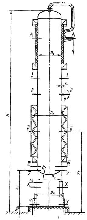 Постановлением Государственного комитета СССР по стандартам от 15 мая 1981 г. № 2411 срок введения установлен с 01.07.81 Несоблюдение стандарта преследуется по закону Настоящий стандарт распространяется на аппараты колонного типа по ГОСТ 24305-80. Стандарт устанавливает методы расчета на прочность колонных аппаратов, работающих под действием внутреннего, избыточного или наружного давления, собственного веса и изгибающих моментов от ветровых нагрузок или сейсмических воздействий, а также изгибающих моментов, возникающих от действия ветровых нагрузок. Стандарт полностью соответствует СТ СЭВ 1645-79. 1. РАСЧЕТНЫЕ СЕЧЕНИЯ1.1. При расчете колонного аппарата устанавливаются следующие основные расчетные сечения: поперечные сечения корпуса колонны, переменные по толщине стенки или диаметру (I-I, II-II, ..., Z-Z по черт. 1); для аппаратов постоянного сечения (по диаметру и толщине стенки) - только поперечное сечение в месте присоединения опорной обечайки; поперечное сечение в месте присоединения опорной обечайки к корпусу колонны (Z-Z по черт. 1, 2); поперечное сечение опорной обечайки в местах расположения отверстий (X-X по черт. 1, 2); поперечное сечение в месте присоединения опорного кольца (Y-Y по черт. 1, 2). Расчетные сечения колонного аппарата Черт. 1 Цилиндрические опорные обечайки Черт. 2 Примечание. Черт. 1 и 2 не определяют конструкцию и приведены только для указания расчетных размеров. 1.2. Для расчета местных нагрузок следует рассмотреть дополнительные расчетные сечения (А-А, В-В по черт. 1). Термины, использованные в стандарте, и их условные обозначения приведены в справочном приложении. 2. РАСЧЕТНЫЕ НАГРУЗКИ И РАСЧЕТНАЯ ТЕМПЕРАТУРА2.1. Расчетные давления2.1.1. Расчетное давление p1 в рабочих условиях для каждого расчетного сечения и пробное давление р2, измеряемое в верхней части колонны, - по ГОСТ 14249-80. 2.1.2. Гидростатическое давление рн во время гидроиспытания колонны в вертикальном положении необходимо определять для каждого расчетного сечения по формуле pН = g·(Н-х0). (1) Для воды g = 10-5 Н/мм3 (10-3 кгс/см3) 2.2. Нагрузки от собственного веса.При расчете колонн должны быть учтены следующие весовые нагрузки: G1 - вес колонны в рабочих условиях, включая вес обслуживающих площадок, изоляции, внутренних устройств и рабочей среды, Н (кгс); G2 - вес колонны при гидроиспытании, включая вес жидкости, заполняющей колонну, Н (кгс); G3 - максимальная нагрузка колонны от собственного веса в условиях монтажа, Н (кгс); G4 - минимальная нагрузка колонны от собственного веса в условиях монтажа (после установки колонны в вертикальное положение), Н (кгс). Примечание. Необходимо учитывать, что нагрузка от веса воды, заполняющей колонну в условиях испытания, действует только на нижнее днище и расчетные сечения опорной обечайки. 2.3. Расчетные изгибающие моменты2.3.1. Максимальный изгибающий момент МG от действия эксцентрических весовых нагрузок, в том числе от присоединяемых трубопроводов и других нагрузок, необходимо определять для каждого расчетного сечения. 2.3.2. Изгибающие моменты MV от действия ветровых нагрузок - по ГОСТ 24756-81. 2.3.3. Изгибающие моменты от сейсмических воздействий МR по ГОСТ 24756-81. 2.4. Снеговые нагрузки.При расчете колонных аппаратов снеговые нагрузки не учитывают. 2.5. Температурные нагрузки.В случае необходимости температурные напряжения определяют специальными методами расчета. 2.6