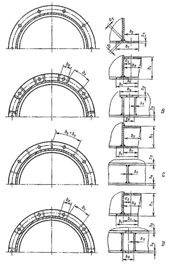 Для опорного узла исполнения С вместо b4 принимается b5, a для исполнения D (b6 +b7). Проверку следует проводить по формуле (24) s1x £ [s]п, (24) где [s]п - предельное напряжение изгиба принимается по действующей нормативно-технической документации. 6.9. Высота нижнего опорного узла исполнений С и D. Исполнения опорного узла Черт. 8 Высоту h1 опорного узла при выполнении условия b2 = b5, следует определять по формуле (25) h1 при s5 » 2s3