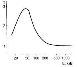 Концентрация РПЦ в ЗЭ и пропорциональная ей интенсивность (I) радиационного сигнала в спектре ЭПР зависит от энергии ионизирующего излучения. Особенно заметно эта зависимость проявляется при энергиях гамма-квантов менее 0,2 Мэв. В связи с этим энергетическая зависимость чувствительности ЗЭ, облученной в свободной геометрии, существенно отличается от таковой для эмали зуба в челюсти (in situ), находящейся за слоем 1 г/см2 ткани. Поэтому именно последнюю зависимость, приведенную на рисунке И.1, табулированные значения которой представлены в таблице И.1, учитывают при определении поглощенной дозы.
