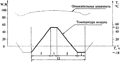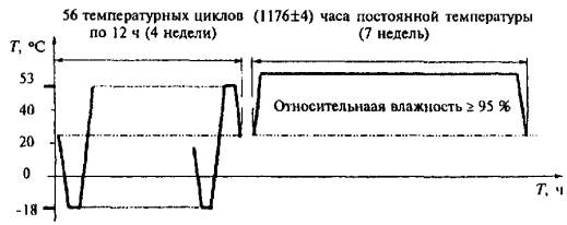 Рисунок А.2 - График одного цикла испытаний (первая чисть испытаний по режиму IV) - вторая часть испытаний заключается в воздействии на образцы постоянной температуры (58±1) °С и относительной влажности воздуха ³ 95 % в течение 7 недель. В том случае если две части испытания проводятся в разных камерах, между ними допускается интервал 2-4 ч для перемещения испытываемых образцов из одной камеры в другую. ПРИЛОЖЕНИЕ Б(информационное) Библиография[1] pr EN 1279-2 Стекло в строительстве - Стеклопакеты - Метод испытания на долговечность и требования к влагопроницаемости ПРИЛОЖЕНИЕ В(информационное) Сведения о разработчиках стандартаНастоящий стандарт разработан группой исполнителей в составе: Н. В. Шведов, Госстрой России (руководитель); Г. А. Строкова, ОАО «Полимерстройматериалы»; В. И. Третьяков, ОАО «Полимерстройматериалы»; А. Г. Чесноков, ОАО «ГИС»; О. А. Емельянова, ОАО «ГИС»; В. Баммингер, «Glastechniche Industrie Peter Lisec GmbH»; И. Б. Дементьев, «Glastechniche Industrie Peter Lisec GmbH»; C. A. Трунцев, ЗАО «Стеклостройкомплект».