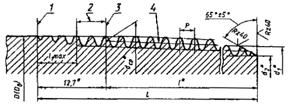 Примечание. Размер Dв приведен для труб с высаженными наружу концами. *Размеры для справок. 1 - конец сбега резьбы; 2 - нитки со срезанными вершинами; 3 - основная плоскость; 4 - линия среднего диаметра резьбы Черт. 6 Таблица 10 Резьбовые соединения гладких труб и муфт к ним мм
