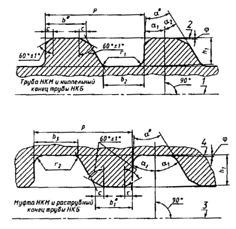 Примечания: 1. Предельные отклонения шага резьбы на длине, не превышающей 25,4 мм, допускаются для расстояния между любыми двумя нитками с полным профилем. Для расстояния между нитками более 25,4 мм допускается увеличение предельных отклонений пропорционально увеличению расстояния, но не свыше указанных в таблице для всей длины резьбы с полным профилем. 2. Предельные отклонения конусности (отклонения от разности двух диаметров) приняты на длине резьбы 100 мм и относятся к среднему диаметру резьбы трубы и муфты, а также к наружному диаметру резьбы трубы и внутреннему диаметру резьбы муфты. 2.13.7. После свинчивания трубы и муфты на станке торец муфты должен совпадать с концом сбега резьбы на трубе (см. черт. 6). Предельные отклонения...±Р1. 2.13.8. Для выхода резьбообразующего инструмента на середине муфты может быть проточена канавка на глубину, не превышающую высоту профиля h1 более чем на 0,5 мм. Канавка не должна иметь острых углов (подрезов). При отсутствии канавки допускается перерез встречных ниток на расстоянии не свыше (13 - P) мм, считая от середины муфты в обе стороны. 1 - измерительная плоскость резьбового калибра-кольца; 2 - резьбовой калибр-кольцо; 3 - труба; 4 - резьбовой калибр-пробка; 5 - муфта; 6 - измерительная плоскость резьбового калибра-пробки Черт. 7 2.14. Основные параметры и размеры соединений гладких высокогерметичных труб и муфт к ним - НКМ 2.14.1. Формы и размеры профиля резьбы труб с условным диаметром от 60 до 102 мм и муфт к ним должны соответствовать указанным на черт. 8 и в табл. 13, а для труб с условным диаметром 114 мм и муфт к ним - на черт. 9 и в табл. 13. Таблица 13 Размеры, мм