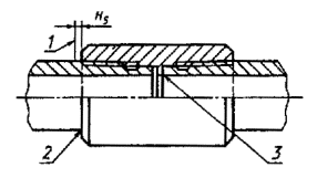 Примечания 1 Предельные отклонения шага резьбы на длине, не превышающей 25,4 мм, допускаются для расстояния между любыми двумя нитками с полным профилем. Для расстояния между нитками более 25,4 мм допускается увеличение предельных отклонений пропорционально увеличению расстояния, но не свыше указанных в таблице для всей длины резьбы с полным профилем. 2 Предельные отклонения конусности (отклонения от разности двух диаметров) приняты на длине резьбы 100 мм и относятся к наружному и внутреннему диаметрам резьбы труб и муфт. Конусность по внутреннему диаметру резьбы гладких высокогерметичных труб должна проверяться на длине резьбы с полным профилем и со срезанными вершинами (до начала сбега резьбы). Для труб с условным диаметром 114 мм измерительная плоскость гладкого калибра-кольца должна совпадать с торцом трубы или не доходить до торца на величину H1 = 1,6 мм (см. черт. 11). (Измененная редакция, Изм. № 2). 2.14.7. Натяг оцинкованной или фосфатированной резьбы муфты по резьбовому калибру-пробке должен быть равен величине Н2 (см. черт. 11): 5,0-1,2 мм - для муфт к трубам условным диаметром от 60 до 102 мм; 6,0-2,5 мм - для муфт к трубам условным диаметром 114 мм. Измерительная плоскость гладкого калибра-пробки при проверке оцинкованной или фосфатированной резьбы муфты к трубам с условным диаметром от 60 до 102 мм должна совпадать с торцом муфты или утопать относительно торца муфты не более чем на Н3 = 1,2 мм (см. черт. 11). При проверке резьбы муфт к трубам с условным диаметром 114 мм измерительная плоскость гладкого калибра-пробки должна утопать относительно торца муфты на величину Н3 = 6,0...8,5 мм (см. черт. 11). 2.14.8. При определении величины диаметра оцинкованной или фосфатированной уплотнительной конической расточки муфты измерительная плоскость гладкого калибра-пробки должна находиться от торца муфты на расстоянии Н4 (см. черт. 11): 45-1,2 мм - для труб условными диаметрами 60 и 73 мм; 55-1,2 мм « « « « 89 и 102 мм; 84 (Измененная редакция, Изм. № 2). * Размеры для справок. 1 - конец сбега резьбы 2 - нитки со срезанными вершинами; 3 - основная плоскость; 4 - длина резьбы с полным профилем; 5 - сбег резьбы; 6 - расчетная плоскость Черт. 10 Примечание. Допускается замена фаски (35±5)° у торца муфты радиусом округления, не превышающим ширину фаски. 1 - измерительная плоскость резьбового и гладкого калибров-колец; 2 - резьбовой и гладкий калибры-кольца; 3 - труба; 4 - резьбовой калибр-пробка; 5 - гладкий калибр-пробка; 6 - муфта; 7 - измерительная плоскость резьбового калибра-пробки; 8 -измерительная плоскость гладкого калибра-пробки; 9 - гладкий калибр-кольцо для проверки труб с условным диаметром от 60 до 102 мм; 10 - гладкий калибр-кольцо для проверки труб с условным диаметром 114 мм; 11 - измерительная плоскость гладкого калибра-кольца Черт. 11 1 - конец сбега резьбы; 2 - соединение, свинченное вручную; 3 - соединение, свинченное на станке Черт. 12 2.14.9. При свинчивании вручную оцинкованных или фосфатированных муфт с трубами натяг должен быть равен величине H5 (черт. 12): 4,4 мм - для труб условным диаметром 60 мм; 5,0 мм « « « « 73 мм; 5,6 мм « « « « 89 мм; 6,2 мм « « « « 102 мм; 8,0 мм « « « « 114 мм. Предельные отклонения ...±2 мм. Допускается подбор муфт и концов труб по натягу. Таблица 17 Соединения ниппельного конца безмуфтовых труб с высаженными наружу концами - НКБ мм