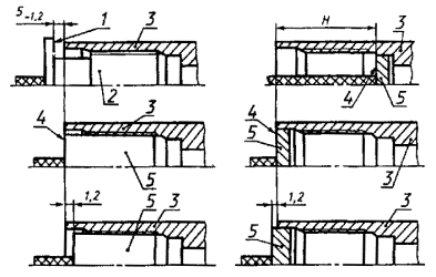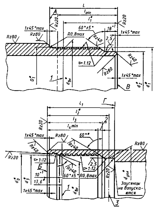 Примечание. Конец сбега резьбы может находиться на фаске, расположенной между резьбой и уплотнительной конической расточкой (для труб с условным диаметром 114 мм). 2.15. Основные параметры и размеры соединений безмуфтовых труб с высаженными наружу концами - НКБ 2.15.1. Форма и размеры профиля резьбы ниппельного и раструбного концов труб должны соответствовать указанным на черт. 8 и в табл. 13. 2.15.2. Размеры соединений должны соответствовать указанным на черт. 13 и в табл. 17 (для ниппельного конца) и на черт. 13 и в табл. 18 (для раструбного конца). (Измененная редакция, Изм. № 2, 3). 2.15.3. Предельные отклонения от номинальных размеров резьбы должны соответствовать указанным в табл. 16. 2.15.4. Предельные отклонения конусности на всей длине уплотнительной конической расточки раструбного конца трубы и уплотнительного конического пояска ниппельного конца трубы соответственно +0,06 и ±0,03 мм. 2.15.5. При определении натяга резьбы ниппельного конца трубы измерительная плоскость гладкого и резьбовых калибров-колец с полным и неполным профилем должна находиться от торца трубы на расстоянии 18+1,2 мм (черт. 14). 2.15.6. При определении величины диаметра уплотнительного конического пояска ниппельного конца трубы измерительная плоскость гладкого калибра-кольца должна совпадать с торцом трубы или не доходить до торца не более чем на 1,2 мм (см. черт. 14). 2.15.7. Натяг резьбы раструбного конца трубы по резьбовому калибру-пробке должен быть равен 5-1,2 мм (черт. 15). Измерительная плоскость гладкого калибра-пробки при проверке резьбы раструбного конца трубы должна совпадать с торцом трубы или утопать относительно торца не более чем на 1,2 мм (см. черт. 15). * Размеры для справок. 1 - основная плоскость; 2 - сбег резьбы; 3 - расчетная плоскость Черт. 13 1 - измерительная плоскость резьбовых (с полным и неполным профилем) и гладкого калибров-колец; 2 - резьбовой (с полным и неполным профилем) и гладкий калибры-кольца; 3 - ниппельный конец трубы; 4 - гладкий калибр-кольцо; 5 - измерительная плоскость гладкого калибра-кольца Черт. 14 1 - измерительная плоскость резьбового калибра-пробки; 2 - резьбовой калибр-пробка; 3 - раструбный конец трубы; 4 - измерительная плоскость гладкого калибра-пробки; 5 - гладкий калибр-пробка Черт. 15 2.15.8. При определении величины диаметра уплотнительной конической расточки раструбного конца трубы измерительная плоскость гладкого калибра-пробки должна находиться от торца раструбного конца трубы на расстоянии H (см. черт. 15): 54 мм - для труб условным диаметром 60 мм; 59 мм - для остальных диаметров труб. Предельное отклонение +1,2 мм. 2.15.9. При определении величины диаметра конической выточки раструбного конца трубы измерительная плоскость гладкого калибра-пробки должна совпадать с торцом трубы или не доходить до торца не более чем на 1,2 мм (см. черт. 15). 2.15.10. Упорные поверхности А, Б, В и Г должны быть перпендикулярны к оси резьбы. Предельное отклонение от перпендикулярности - 0,06 мм. Предельное отклонение от плоскостности на ширине упорных поверхностей труб - 0,06 мм. 2.15.11. Оси резьб и оси уплотнительных конических поверхностей ниппельного и раструбного концов труб должны совпадать. Предельное отклонение от соосности - 0,04 мм. 2.15.12. Поверхность гладкой части резьбового конуса ниппельного конца трубы, расположенная за сбегом резьбы, должна являться продолжением поверхности, образованной верши