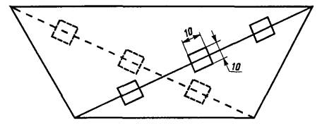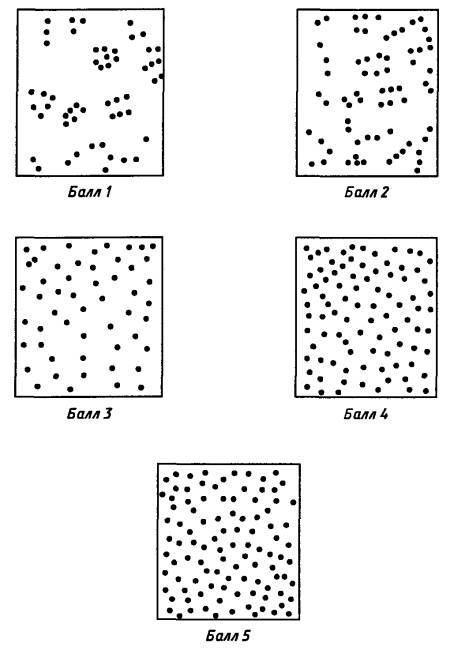 ПРИЛОЖЕНИЕ Б(обязательное) Методика определения газовой пористости в алюминиевых литейных сплавахБ.1. Изготовление макрошлифов Б.1.1. При определении пористости в алюминиевых литейных сплавах усадочная рыхлость или центральная пористость исключается. Б.1.2. Для определения газовой пористости темплеты, вырезанные из чушек по 4.2.6, отливки или образцы, вырезанные из отливок, обрабатывают до шероховатости Ra не более 1,6 мкм. При обработке с эмульсией поверхность темплета очищают бензином или ацетоном. Б.1.3. Макрошлиф готовят из темплетов последовательным шлифованием на шлифовальных шкурках различной зернистости: 80-100 мкм, 40-50 мкм, 10-14 мкм, промывают проточной водой и просушивают фильтровальной бумагой. Подготовку макрошлифа можно производить другими способами, обеспечивающими шероховатость не более 1,6 мкм. Б.1.4. Для определения газовой пористости макрошлиф травят 10-15 %-м водным раствором едкого натра (NaOH) при температуре 60-80 °С. Макрошлиф погружают в реактив и выдерживают в течение 10-50 с (не выявляя макроструктуры), затем промывают проточной водой и просушивают фильтровальной бумагой. При необходимости осветления поверхности макрошлиф опускают в 20 %-й раствор азотной кислоты на 2-5 с, промывают проточной водой и просушивают фильтровальной бумагой. Б.2. Проведение испытаний Б.2.1. Для определения газовой пористости необходимо пользоваться шкалой, приведенной на рисунке Б.1. Степень пористости макрошлифов в баллах устанавливают сравнением их с эталонами шкалы. Б.2.2. Газовая пористость темплетов чушек определяется на трех квадратах площадью 1 см2 каждый (рисунок Б.2). Количество пор и размер пор определяют как среднее арифметическое трех измерений. При наличии отклонений по среднему количеству, размеру или процентному содержанию пор в сторону увеличения показатели пористости относят к более высокому баллу пористости. Последовательность нанесения квадратов: а) на поверхности макрошлифа провести диагональ; б) измерить диагональ; в) разделить диагональ на две равные части для определения центра среднего квадрата; г) нанести средний квадрат на макрошлиф так, чтобы диагональ макрошлифа делила его на две равные части, а боковые стороны квадрата были перпендикулярны ей; д) измерить расстояние от края макрошлифа до боковой стороны квадрата по диагонали темплета; е) полученное расстояние разделить пополам для определения центров остальных двух квадратов; ж) нанести остальные два квадрата (см. подпункт г). Газовую пористость отливок определяют на трех квадратах площадью 1 см2 каждый. Расположение квадратов произвольное в зависимости от конфигурации и размеров отливок, если нет особых требований в конструкторской документации. На малогабаритных отливках газовую пористость допускается определять на меньшем количестве квадратов. Б.2.3. Балл пористости, определенный по трем квадратам на двух макрошлифах темплетов чушек, распространяют на всю плавку. Б.2.4. Контроль пористости проводят визуально, невооруженным глазом. Для определения диаметра пор можно пользоваться оптическими приборами с увеличением до 10 раз. Б.2.5. Шкала состоит из пяти эталонов: балл 1 - мелкая пористость; балл 2 - пониженная пористость; балл 3 - средняя пористость; балл 4 - повышенная пористость; балл 5 - высокая пористость. (Поправка, ИУС 7-2004). Б.2.6. Допускаемое количество пор на 1 с