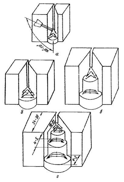 Варианты "а" и "б" предусматривают наращивание нижней кромки, вариант "в" - заполнение разделки "стенками". Все слои, кроме первого, выполняют валиками при вылете проволоки 30-40 мм. 6.28. Горизонтальное соединение большой длины конструкций толщиной 6-20 мм при угле скоса верхней кромки, меньшем 45°, следует выполнять по технологии, представленной в табл. 4. Нижнее положение 6.29. Сварку в нижнем положении следует выполнять при режимах, указанных в табл. 5. 6.30. Техника сварки стыковых швов в нижнем положении представлена на рис. 12. Рис. 12. Техника выполнения в нижнем
