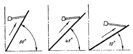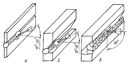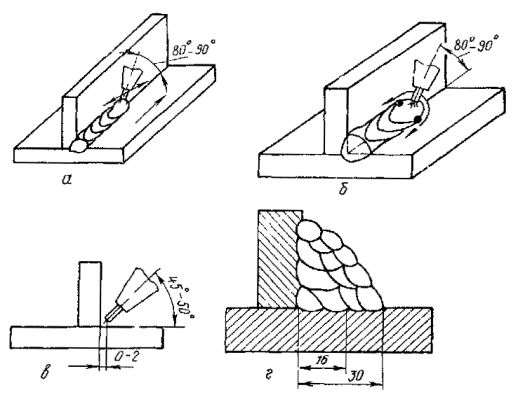 таврового шва: 6.13. Второй и последующие слои необходимо накладывать после зачистки поверхности застывшей ванны при минимальном вылете проволоки. 6.14. Тавровые швы катетом 8-16 мм следует закладывать по схеме, указанной в п. 6.10 настоящей инструкций (рис. 5, а). При этом сварку следует вести при минимальном вылете проволоки и угле наклона электрода к оси шва 100-110°. Перемещение электрода вверх по направлению сварки необходимо начинать вне ванны по корню разделки стыка, задерживая его в местах, отмеченных на рис. 5, а точками. 6.15. Первый слой многослойных тавровых швов следует накладывать в соответствии с указаниями п. 6.14 настоящей инструкции. При наложении валика катетом более 16 мм необходимо проваривать дугой середину ванны для обеспечения равномерного заполнения валика по всему поперечному сечению. При наложении многослойных вертикальных тавровых швов наплавленный металл следует распределять по слоям так, чтобы толщина каждого слоя составляла 3-5 мм. Валик следует накладывать при минимальном вылете проволоки, задерживая электрод в местах, отмеченных на рис. 5, б точками. Наклонное положение 6.16. К наклонным отнесены положения, представленные на рис. 6, и промежуточные. 6.17. В наклонном положении сварку следует выполнять при режимах, указанных в табл. 2. Рис. 6. Наклонные положения электрода 6.18. Стыковые соединения толщиной 4-6 мм, а также тавровые катетом 4-6 мм при угле наклона до 45° следует выполнять способом сверху - вниз, при угле наклона 60° - снизу - вверх при минимальной скорости подачи проволоки, используя технику наложения шва, аналогичную рекомендованной для сварки этих соединений в вертикальном положении (см. рис. 3, а, б). 6.19. Соединения толщиной 8-14 мм при углах наклона до 45-50° можно выполнять двумя способами: сваривать в два прохода при максимальной скорости подачи проволоки. Первый слой накладывают сверху - вниз, второй - снизу - вверх, используя технику манипулирования электродом, представленную на рис. 7; сваривать в один проход при минимальной скорости подачи проволоки, используя манипуляции электрода, аналогичные манипуляциям в вертикальном положении. При угле наклона более 45° соединения выполняют аналогично вертикальным. Рис. 7. Техника манипулирования электродом при наложении второго слоя наклонных под углом 30-45° соединений конструкций толщиной 8-14 мм 6.20. Способы выполнения соединений толщиной 16-20 мм зависят от их длины. Таблица 2