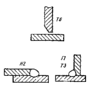 тавровых швов в нижнем положении: Многослойные швы тавровых соединений выполняют при вылете проволоки 40-50 мм, перемещая электрод без поперечных колебаний. Рациональное распределение валиков в швах катетом 16 -30 мм приведено на рис. 13, г. 6.33. Тавровые соединения с односторонним скосом кромок выполняют аналогично горизонтальным стыковым соединениям. 6.34. При обрыве дуги (прекращении сварки) кратер ванны необходимо зачистить от шлака, возбудить дугу на расстоянии 10 - 15 мм от места обрыва и перенести на кратер. Заварку кратера следует производить быстрыми поперечными колебаниями конца электродной проволоки, затем резко оборвать дугу. 6.35. Подварку корня шва допускается выполнять штучными электродами Э50А. 6.36. При автоматической сварке под флюсом допускается выполнение подварочных швов, наложение отдельных слоев и исправление дефектов проволокой ППВ-5. 7. КОНТРОЛЬ КАЧЕСТВА СВАРНЫХ СОЕДИНЕНИЙ7.1. Способы контроля качества сварных соединений - по ГОСТ 3242-69 "Швы сварных соединений. Методы контроля качества" и СНиП III-18-75 "Металлические конструкции. Правила производства и приемки работ", а также ППР. Определение механических свойств - по ГОСТ 6966-75; контроль неразрушающими методами - по ГОСТ 14782-76, ГОСТ 7512-75, ГОСТ 23055-78; металлографические исследования - по ГОСТ 5640-68, ГОСТ 1778-70. 7.2. До начала и в процессе сварки следует контролировать: а) состояние порошковой проволоки в соответствии с ТУ завода-изготовителя; б) соответствие характеристики источника питания требованиям п. 5.2 настоящей инструкции; в) равномерность подачи проволоки и надежность ее контакта с токоподводящим мундштуком держателя; г) качество сборки, подготовки кромок и их очистки от загрязнений, очистки прихваток от шлака, а также наличие трещин в прихватках; д) соблюдение режимов, техники манипулирования электродом. 7.3. После сварки необходимо провести внешний осмотр соединений для выявления внешних дефектов: трещин, пор и подрезов. 7.4. Дефектные места следует удалить или исправить. Повторную сварку дефектных мест производят электродами Э50А или Э42А. 8. ДЕФЕКТЫ СВАРНЫХ ШВОВ И СПОСОБЫ ИХ ПРЕДУПРЕЖДЕНИЯ8.1. При соответствии проволоки техническим условиям дефекты в сварных швах являются следствием нарушения технологии сварки или неисправности оборудования. 8.2. Основные дефекты в сварных швах, выполненных порошковой проволокой ППВ-5, и способы их предупреждения приведены в табл. 6. Таблица 6