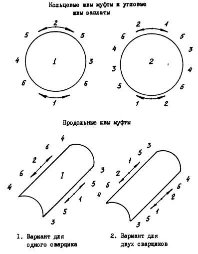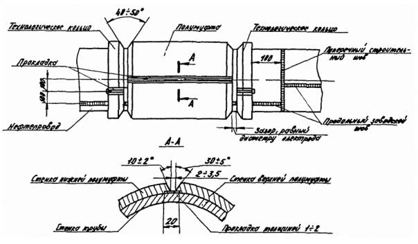 4.3. Длина муфты без технологических колец должна быть в пределах 150÷300 мм. 4.4. При длине муфты более 300 мм должны быть использованы технологические кольца. 4.5. Длина технологического кольца должна быть не менее 65, 80, 110, 120, 150, 180 мм соответственно для нефтепроводов диаметрами 426, 530, 720, 820, 1020, 1220 мм. 4.6. Для нефтепроводов диаметрами 219÷377 мм следует использовать муфты без технологических колец. 4.7. Заплаты, муфты и технологические кольца должны быть изготовлены из листового металла или трубы, механические свойства, химический состав и толщина стенок которых такие же, как у ремонтируемого участка нефтепровода. 4.8. Размеры заплат и муфт должны быть таковы, чтобы перекрывали место коррозионного повреждения стенки трубы не менее 40 мм по периметру. 4.9. Муфты и кольца изготавливаются из двух половин. Зазор между кромками при сборке муфты или кольца должен быть равномерным по всему продольному направлению и составлять в пределах 2÷3,5 мм. 4.10. Для получения требуемого зазора между кромками при сборке муфты или кольца допускается приварка сборочных скоб. 4.11. Продольные кромки половин муфты и колец должны быть обработаны под стандартную V-образную разделку с углом скоса кромок 30±5° и выборкой под металлическую прокладку. При выполнении сварного шва вдоль боковой образующей нефтепровода скос нижней кромки следует уменьшить до 10±2°. 4.12. Поперечные кромки муфты и технологических колец должны быть обработаны под углом 20÷25° без притупления. Кольца обрабатываются с одной стороны. 4.13. Муфта и кольца должны плотно прилегать к наружной поверхности трубы. 5. КОНТРОЛЬ ЗА СОСТОЯНИЕМ ВОЗДУШНОЙ СРЕДЫ НА МЕСТЕ ПРОВЕДЕНИЯ ПРИВАРКИ ЗАПЛАТ И МУФТ5.1. Контроль за состоянием воздушной среды на месте проведения приварки заплат и муфт должен осуществляться согласно "Отраслевой инструкции по контролю воздушной среды на предприятиях нефтяной промышленности" ИБВТ 1-087-81 и требованиям настоящей Инструкции. 5.2. Контроль воздушной среды должен проводиться в присутствии лица, ответственного за проведение сварочных работ на нефтепроводе под давлением. 5.3. При сварочных работах воздушная среда должна контролироваться непосредственно на месте приварки заплат и муфт, а также в опасной зоне с учетом возможных источников выделения паров и газов. непосредственно перед началом газоопасных работ; при приварке заплат и муфт не реже чем через один час и после перерыва. Состояние воздушной среды в опасной зоне с учетом возможных источников выделения паров и газов проверяется ежедневно перед началом работ и после перерыва. Результаты анализа заносятся в табл. п.9. Разрешения (прил.3). 5.5. Состояние воздушной среды в траншее, независимо от установленной периодичности, необходимо проверять по первому требованию сварщика, его помощника или представителя пожарной охраны, технической инспекции профсоюза и работников службы техники безопасности, если у них возникает опасение о появлении паров нефти или газа. 5.6. Допуск работников к приварке заплат и муфт возможен, если содержание паров и газов в воздухе в зоне производства работ не выше предельно допустимой концентрации (ПДК) по санитарным нормам. 5.7. Предельно допустимая концентрация по санитарным нормам углеводородов С1-С10 в пересчете на углерод равна 300 мг/м3, а сероводорода в смеси с углеводородами С1-С5 - 3 мг/м3. 6. ПРИВАРКА ЗАПЛАТ И МУ