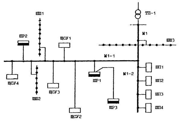 5.10.8. Питающие сети должны прокладываться преимущественно открыто. Применение трубных электропроводок должно обосновываться. 5.11. Пример расчета электрических нагрузок для силовых сетей общего назначения напряжением до 1 кВ представлен в табл. 5.1. Расчет был произведен для следующей принципиальной схемы.