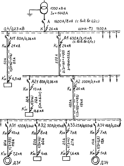 Из этих расчетов следует, что для линий 32, 33, 34 проверку соответствие требованиям § 3.1.8 можно не делать, т. к. номинальные токи плавких вставок предохранителей по отношению к длительно допустимым токовым нагрузкам проводников на этих линиях имеют кратность не более 300 %. Для линий 2 и 31 учтем допущение параграфа 3.1.13 (текст параграфа см. п. 11). 6.1.2. Требуемая допустимая длительная токовая нагрузка проводника для линии 2 равна 210 А (630:3). Длительно допустимые токи для четырехжильных кабелей сечением 120 и 150 мм2 равны соответственно 184 и 216 А (см. табл. 5). Таким образом, четырехжильный кабель сечением 120 мм2, выбранный для линии 2 по расчетной нагрузке, является, в соответствии с § 3.1.13, проводником ближайшего меньшего сечения, и расчетную проверку на соответствие требованиям § 3.1.8 для этой линии можно не выполнять. 6.1.3. Для линии 31 требуемая допустимая длительная токовая грузка проводника равна 167 А (500:3). Проводником ближайшего меньшего сечения для этого значения тока является трехжильный кабель сечением 70 мм2 (см. табл. 5), тогда как по расчетной нагрузке для этой линии выбран кабель сечением 50 мм2. Следовательно, для этой линии необходима расчетная проверка на соответствие требованиям § 3.1.8. В результате расчета получено значение тока однофазного короткого замыкания в точке К¢31, равное 2 кА. Согласно § 3.1.8 отношение наименьшего тока КЗ к номинальному току плавкой вставки предохранителя должно быть не меньше значений, приведенных в § 1.7.79, т.е. не меньше, чем 3. В нашем случае это отношение равно 4 (2000:500). Таким образом, увеличивать выбранное по расчетному току сечение линии 31 не требуется. 6.2. Второе значение кратности оговаривается для тока уставки автоматического выключателя, имеющего только максимальный мгновенно действующий расцепитель (отсечку): не более 450 %. В схеме на рис. 1 таких выключателей нет. Поэтому, в отступление от табл. 3, представим себе, что для защиты линии 33 выбран автоматический выключатель ВА13-25-32 с номинальным током расцепителя 25 А и кратностью отсечки 7, имеющий только максимальный мгновенно действующий расцепитель (см. табл. 1). В этом случае, ток уставки автоматического выключателя равен 175 А (25´7) и кратность тока уставки по отношению к длительно допустимой токовой нагрузке проводника равна: