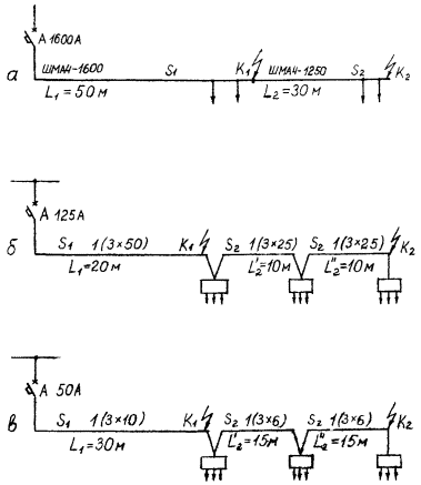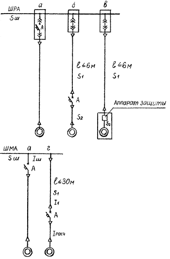 ПРИМЕЧАНИЕ: В числителе указаны нагрузки для трехжильных кабелей, в знаменателе - для четырехжильных (с коэффициентом 0,92). Рис. 1. Схема электрической сети Пояснение. Для линий указаны расчетный ток, сечение и длительно допустимый ток кабеля, для автоматических выключателей - номинальный ток расцепителя и ток отсечки. а. Установка аппаратов защиты в соответствии с основным требованием § 3.1.16. б. Допускаемое решение при l £ 6 м. Можно принимать S1 < Sш, но S1 ³ S2. При этом должны выполняться специальные требования § 3.1.16 к прокладке кабелей. в. При выполнении условий пункта «б» устанавливать выключатель А не требуется, если аппарат защиты поставляется комплектно с механизмом. г. Допускаемое решение при l £ 30 м. Можно принимать S1 < Sш, но I1 ³ Iрасч и I1 ³ 0,1×Iш, где I1 и Iш - длительно допустимые токи кабеля и шинопровода, Iрасч - расчетный ток ответвления. При этом должны выполняться специальные требования § 3.1.16 к прокладке кабелей. Рис. 2. Примеры к § 3.1.16 Рис. 3. Примеры к § 3.1.19 |
