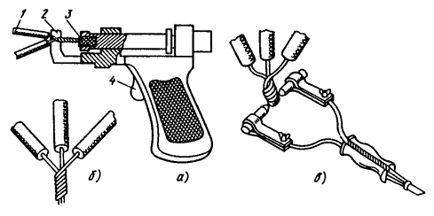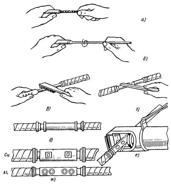 4.1.2. С концов жил удаляют изоляцию на длине, указанной в табл. 4.3. 4.1.3. Жилы зачищают до металлического блеска. 4.1.4. Алюминиевые жилы складывают внахлестку, соединяют их концы двойной скруткой (рис. 4.1, а, б) или оформляют в кольцо круглогубцами. 4.1.5. При пайке алюминиевых жил скрутку нагревают пламенем газовой горелки, одновременно вводя в пламя пруток припоя. После нагрева жил до температуры плавления припоя натирают желобок и место скрутки с одной стороны прутком припоя. В результате трения пленка окиси разрушается, желобок и скрутка облуживаются и заполняются припоем. Аналогично пропаивают другую сторону скрутки. 4.1.6. При пайке медных жил на скрутку (рис. 4.1, а) или кольцо наносят мелко истолченную канифоль или флюс КСп, пропаивают скрутку припоем с помощью паяльника или погружают оформленную в кольцо жилу в расплавленный припой на 1-4 с. Таблица 4.2
