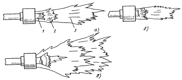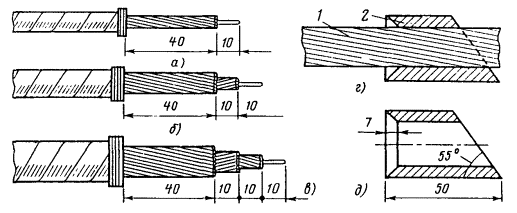 *При оформлении медных жил в кольцо изоляцию удаляют на длине 30-35 мм Рис. 4.1. Соединение и ответвление жил сечением до 10 мм2 пайкой 4.1.7. Излишки припоя удаляют с поостывшего соединения чистой ветошью; место пайки изолируют. 4.2. СОЕДИНЕНИЕ И ОТВЕТВЛЕНИЕ ЖИЛ СЕЧЕНИЕМ 16-240 мм2 НЕПОСРЕДСТВЕННЫМ СПЛАВЛЕНИЕМ ПРИПОЯ В ФОРМАХ (МЕДНЫХ ГИЛЬЗАХ) ИЛИ ПОЛИВОМ ПРЕДВАРИТЕЛЬНО РАСПЛАВЛЕННЫМ ПРИПОЕМ4.2.1. Для соединения и ответвления применяют набор НСПУ (для пайки непосредственным сплавлением припоя) или тигель, паяльную ложку, разъемные формы или формы из кровельной стали для пайки поливом (приложения 21-25), защитный экран, стальную щетку, напильник длиной 200 мм с насечкой № 2, кисточку для нанесения флюса и стальной скребок, мешалку (проволочный щуп), ручную ножовочную рамку с ножовочным полотном для металла; для соединения или ответвления в гильзах - медные соединительные или ответвительные гильзы (приложения 26, 27); термометр со шкалой 0-300° С. 4.2.2. При пайке алюминиевых жил применяют припои, указанные в табл. 4.1, медных - оловянно-свинцовые припои (табл. 4.2) и мелко истолченную канифоль или флюс КСп. Данные по расходу материалов приведены в приложении 28. 4.2.3. С концов алюминиевых жил удаляют изоляцию на длине: Сечение жилы, мм2............................. 16-35 50-95 120 и выше Длина удаляемой изоляции, мм.......... 50 60 70 С концов медных жил удаляют изоляцию на длине, равной половине длины гильзы плюс 10 мм. 4.2.4. У кабелей с бумажной изоляцией с оголенной части жилы удаляют масло-канифольный состав чистой ветошью, смоченной бензином или ацетоном. 4.2.5. Секторные жилы скругляют, используя механизмы и инструмент, перечисленные в разд. 2. 4.2.6. Жилы зачищают до металлического блеска. 4.2.7. С зачищенных концов жил снимают повивы ступенями (рис. 4.2, а-в соответственно для жил сечением 16-35; 50-95 и 120-240 мм2) или отрезают жилы 1 под углом 55° с помощью шаблона 2 (рис. 4.2, г, д). 4.2.8. Края изоляции жил обматывают несколькими витками асбестового шнура. Рис. 4.2. Разделка концов жил сечением 16-240 мм2 перед пайкой 4.2.9. Облуживают концы жил следующим образом: алюминиевые жилы при соединении и ответвлении непосредственным сплавлением припоя прогревают до плавления припоя, вводят палочку припоя в пламя горелки и наносят припой на всю ступенчатую поверхность концов жил, включая их торцы, тщательно растирают припой стальной кисточкой до полного облуживания жилы; концы алюминиевых жил при соединении сплавлением припоя в медных гильзах облуживают сначала припоем А, затем припоем ПОССу. Припоем ПОССу после предварительной очистки облуживают медные соединительные гильзы; медные жилы облуживают оловянно-свинцовым припоем. 4.1.10. Концы жил 1 (рис. 4.3, а) вводят в формы (гильзы) 2 так, чтобы стык жил находился в середине формы (для жил со срезанными под углом 55° концами зазор между торцами около 2 мм). Разъемные формы скрепляют бандажами из мягкой стальной проволоки, формы из кровельной стали - с помощью замка. 4.2.11. Место входа жил в форму уплотняют подмоткой из асбестового шнура 7. Формы устанавливают горизонтально для обеспечения полной заливки припоем, надевают на жилы защитные экраны 5 (приложение 29). При соединении жил сечением 120 мм2 и более рекомендуется дополнительно устанавливать охладители. В этом случае длина первой ступени разделываемого конца кабеля увеличивается от 40 до 55 мм (рис. 4.2, в). 4.2.12. Пламенем горелки 3 нагреваю