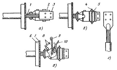 *f1 - размер пружины в сжатом состоянии. 5.3.8. Жилы, оконцованные наконечниками из твердых алюминиевых сплавов, соединяют с плоскими выводами из меди, стали или твердого алюминиевого сплава стальными болтами, гайками и шайбами (рис. 5.4, в, г). 5.3.9. Жилы соединяют с выводами электротехнических устройств из меди, стали или твердого алюминиевого сплава, расположенных на открытом воздухе, в сырых помещениях* и помещениях с агрессивной средой** после их оконцевания медно-алюминиевыми наконечниками или наконечниками из твердого алюминиевого сплава в соответствии с требованиями п. 5.3.8. *По ГОСТ 15150-69*. Электротехнические устройства всех исполнений и категорий размещения, кроме размещения 4.1 и исполнений У, УЛ, ТС категорий размещений 3 и 4. **По ГОСТ 15150-69*. Электротехнические устройства, работающие в среде, содержащей коррозионно-активные агенты, состав и концентрация которых превышают нормы атмосферы типа П. 5.3.10. Жилы, оконцованные медно-алюминиевыми наконечниками или наконечниками из твердого алюминиевого сплава, соединяют с плоскими выводами из алюминия в соответствии с требованиями п. 5.3.5. 5.3.11. Два проводника, оконцованные наконечниками, соединяют с плоским выводом с двух сторон вывода (рис. 5.4, д). 5.3.12. Не допускается рассверливать отверстия в выводе или лапке наконечника под болт большего диаметра. 5.3.13. Диаметр болта может быть меньше диаметра отверстия в выводе или наконечнике только на один типоразмер. Например, при диаметре отверстия вывода 13 мм, наконечника 11 мм используется болт М10. 5.3.14. Не разрешается изменять форму и размеры зажимной части наконечника. При невозможности подключения наконечника к выводу, несоответствии диаметров отверстий в выводе и наконечнике, присоединении более двух наконечников следует применять переходные детали (рис. 5.5, в, б). Форма переходной детали (пластина, уголок, косынка и т.п.) зависит от конструкции и расположения вывода; детали изготовляют из того же материала, что и вывод, или однородного. В качестве переходных деталей применяют пластины из меди, медно-алюминиевые и из алюминиевого сплава (рис. 5.5, в). Поперечное сечение переходной детали не должно быть меньше соответствующего сечения контактного вывода. Жилы, оконцованные наконечниками, соединяют с переходными деталями из меди или алюминиевого сплава болтами (рис. 5.5, а) в соответствии с пп. 5.5.3 или 5.5.4. Алюминиевые жилы соединяют с переходными деталями из алюминия, алюминиевого сплава или с алюминиевой частью медно-алюминиевой детали сваркой (рис. 5.5, б, в). Рис. 5.5. Соединение алюминиевых жил с переходными деталями: 1 - переходная деталь; 2 - болт; 3 - гайка; 4 - наконечник; 5 - жила; 6 - шайба; 7 - заклепочный шов; 8 - медно-алюминиевая пластина 5.4. СОЕДИНЕНИЕ МЕДНЫХ ЖИЛ С ПЛОСКИМИ КОНТАКТНЫМИ ВЫВОДАМИ5.4.1. Перед соединением жилы оконцовывают наконечниками или оформляют в кольцо в соответствии с требованиями разд. 2 и 4. Подготовку контактных поверхностей производят согласно требованиям п. 5.3.3. 5.4.2. Однопроволочные жилы сечением до 10 мм2 соединяют с плоскими выводами согласно требованиям п. 5.3.4. Разрешается присоединять к одному выводу две жилы, оформленные в кольцо. 5.4.3. Многопроволочные жилы сечением до 2,5 мм2 соединяют с плоскими выводами из меди, алюминия и его сплавов после изгибания конца жилы в кольцо (или без формирования кольца с применением фасонной шайбы) 