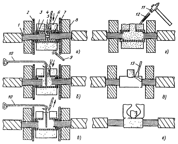 3.2.2. Перед сваркой выполняют следующие подготовительные операции*: подбирают термитные патроны по сечению свариваемых жил; покрывают внутреннюю поверхность кокиля термитного патрона слоем мела, разведенного водой до пастообразного состояния; слой мела следует высушить до начала сварки; собирают термитные патроны, для чего вводят кокиль с двумя алюминиевыми колпачками (в термитных патронах ПА-300-ПА-800 вместо колпачков применяют втулки) в муфель таким образом, чтобы литниковые отверстия кокиля и муфеля были расположены соосно. *Указанные операции рекомендуется выполнять заблаговременно в мастерской. 3.2.3. С концов жил удаляют изоляцию на длине: Сечение жилы, мм................................ 16-50 70; 95 120; 150 185; 240 Длина удаляемой изоляции, мм............. 45 50 55 60 3.2.5. Жилы зачищают до блеска щеткой из кардоленты и протирают тканью, смоченной бензином или ацетоном. 3.2.6. Покрывают жилы тонким слоем флюса, разведенного водой до пастообразного состояния. 3.2.8. Комбинированные и многопроволочные секторные жилы предварительно скругляют плоскогубцами. При соединении секторных однопроволочных жил вместо алюминиевых колпачков применяют секторные втулки А. При отсутствии секторных втулок допускается использовать колпачки; секторные жилы на участке насадки колпачка следует запилить напильником так, чтобы они свободно входили в колпачок. 3.2.9. Свободное пространство между стенками колпачка и жилой заполняют отрезками присадки. 3.2.11. Термитный патрон напевают на слегка отогнутую в сторону жилу и сдвигают на расстояние, равное длине патрона; соединяют торцы жил и сдвигают патрон обратно таким образом, чтобы стык жил находился в центре литникового отверстия. Жилы, как правило, устанавливают в патроне без зазора, однако допускается зазор 2-3 мм. Патроны устанавливают на всех соединяемых жилах. 3.2.12. Зазор между жилой 1 (рис. 3.9, а) и кокилем 3 термитного патрона уплотняют асбестовым шнуром 4. 3.2.13. Дальнейшие подготовительные операции проводят согласно пп. 3.1.16-3.1.18. Рис. 3.9. Термитная сварка алюминиевых жил кабелей до 10 кВ сечением 16-240 мм2: 1 - жила; 2 - защитный экран; 3 - кокиль; 4 - асбестовый шнур; 5 - присадочный пруток; 6 - муфель; 7 - колпачок; 8 - охладитель; 9 - термитная спичка; 10 - мешалка; 11 - молоток; 12 - зубило; 13 - отвертка 3.2.15. Муфель 6 термитного патрона поджигают термитной спичкой 9, плотно прижав ее к торцу муфеля. Сварку рекомендуется начинать с жилы, расположенной вверху разделки. 3.2.16. После окончания горения муфеля в литниковое отверстие вводят мешалку 10 и перемешивают расплавленный металл сварочной ванны для удаления газов и шлака (рис. 3.9, б). При необходимости в литниковое отверстие добавляют присадку. Расплавление жил контролируют мешалкой (рис. 3.9, в), которая должна свободно доходить до дна кокиля. 3.2.17. После застывания металла в литниковом отверстии муфель скалывают зубилом 12 с помощью молотка 11 (рис. 3.9, г) и удаляют кокиль, отогнув его края отверткой 13, конец которой вставляют в зазор между кромками кокиля (рис. 3.9, д). 3.2.18. Остальные операции производят согласно требованиям пп. 3.1.29-3.1.32; удаление литниковой прибыли клещами ПК-1М показано на рис. 3.9, е. СОЕДИНЕНИЕ ЖИЛ КАБЕЛЕЙ 20 И 35 кВ, СЕЧЕНИЕМ 25-185 мм2 3.2.19. Для выполнения соединений применяют принадлежности и инструмент, перечисленный в п. 3.2.1; соединительные гильзы (приложение 11), используемые вместо алюминиевых колпачков, вх