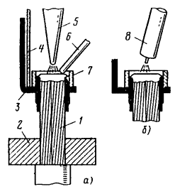 3.3.12. Оконцовывать жилы наконечниками А можно полуавтоматической сваркой без регулятора цикла сварки, а также ручной аргонодуговой сваркой вольфрамовым электродом (рис. 3.13, б). В этом случае используют пониженный режим сварки, который подбирают на пробных образцах; сварочный ток к наконечнику подводят электрододержателем 8. ОКОНЦЕВАНИЕ ЖИЛ СЕЧЕНИЕМ 300-1500 мм2 НАКОНЕЧНИКАМИ Л 3.3.13. Оконцевание жил наконечниками Л осуществляется полуавтоматической аргонодуговой сваркой; допускается дуговая сварка угольным электродом. 3.3.14. Для оконцевания дуговой сваркой неплавящимся угольным электродом применяют: а) однопостовой источник питания постоянного сварочного тока с падающей внешней характеристикой: сварочные преобразователи ПСО-300, ПСО-500 или сварочные выпрямители ВД-301, ВД-302; б) электрододержатель (приложение 14); в) формующее приспособление (приложение 15); г) напильник, плоскогубцы, стальную щетку; д) охладители из набора НСПУ. 3.3.15. Для оконцевания применяют материалы: а) сварочную проволоку СвАК5 диаметром 4 мм для оконцевания жил сечением 300-500 мм2 и диаметром 8 мм - для жил сечением 625-1500 мм2; б) сварочные угли или электроды из отходов графитированных анодов (приложение 17); в) флюс ВАМИ; г) асбестовый картон толщиной 2-4 мм; д) асбестовый шнур диаметром 2 и 4 мм; е) наконечники Л; ж) бензин Б-70 или ацетон; з) обтирочную ветошь. 3.3.16. С концов жил удаляют изоляцию на длине: Сечение жилы, мм2............................................ 300-400 500-800 1000-1500 Длина удаляемой изоляции, мм........................... 125 135 155 3.3.18. Выполняют операции, указанные в пп. 3.1.19, 3.1.41-3.1.43. 3.3.19. Жилу 1 (рис. 3.14, а) закрепляют вертикально, надевают на ее конец наконечник 3, устанавливают на него формующее приспособление 7 и защищают контактную часть наконечника асбестовым картоном 4. 3.3.20. При сварке угольным электродом 5 к охладителю 2 присоединяют сварочный провод от вывода "плюс" источника питания. 3.3.21. Сварку выполняют при токе 150-200 А. Дугу возбуждают на торце жилы и медленно перемещают по спирали к центру жилы, расплавляя проволочки жилы и гильзу наконечника до образования монолита. Сварочную ванну перемешивают и очищают от шлака присадочным прутком 6. Дугу следует направлять на расплавленный металл, не поджигая проволочек жилы. 3.3.22. После остывания металла формующее приспособление и охладитель удаляют, зачищают сварное соединение стальной, щеткой, протирают ветошью, смоченной бензином или ацетоном, и запиливают неровности шва напильником. 3.3.23. При аргонодуговой сварке полуавтоматом ПРМ 8 (рис. 3.14, б) необходимы оборудование, инструмент и материалы, перечисленные в пп. 3.3.2 а, г-ж; 3.3.3 а-г; 3.3.14 в, д и 3.3.15 г, д, ж. 3.3.24. Подготовительные операции выполняют согласно требованиям пп. 3.1.41-3.1.43, 3.3.5, 3.3.16, 3.3.17 и 3.3.19. 3.3.25. К охладителю присоединяют сварочный провод от вывода "минус" источника питания. 3.3.26. Сварку выполняют при токе 150-180 А (скорость подачи электродной проволоки 0,05-0,07 м/с, напряжение на дуге 17-19 В, расход аргона 12-15 л/мин). Сварочную дугу возбуждают на торце жилы и медленно перемещают по спирали к центру жилы, контролируя правильность формирования сварного шва и плавление проволочек жилы. Сварку заканчивают в центре сварного соединения. Рис. 3.14. Приварка наконечников Л к жилам кабелей сваркой угольным электродом (а) и полуавтоматом ПРМ (б) 3.3.27. После остывания металла формующее приспособление удаляют, соединение при необх