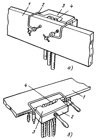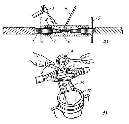 *При отсутствии сварочной проволоки допускается использовать проволоку из повивов жил. Полуформы струбциной 3 прижимают одну к другой и вставляют в направляющие 5 клинья 4. Легким постукиванием молотка по клиньям плотно (без зазоров) прижимают поверхности полуформ одну к другой. На секторные однопроволочные жилы вплотную к торцам формы накладывают уплотнение - 2-3 слоя асбестового шнура на длине 6-7 мм. 3.1.16. На оголенные участки жил устанавливают охладители 6 (рис. 3.3, б), закрепленные на соединительной планке, подводят под охладители опорную стойку* 7 и закрепляют ее. *При соединении проводов допускается охладители, закрепленные на соединительной планке, не крепить на стойке. В этом случае охладители кладут на огнестойкую подкладку (кирпичи, асбоцемент, асбест и т.п.) Рис. 5.3. Установка сварочных форм и охладителей на жилах кабеля сечением 16- 240 мм 3.1.18 Бумажную изоляцию жил за охладителем защищают сухим асбестовым картоном или подмоткой асбестовым шнуром по жилам; при сварке жил с пластмассовой и резиновой изоляцией на участок изоляции длиной около 80 мм за охладителями накладывают слой увлажненного асбеста толщиной не менее 10 мм. Жилы кабеля, не подвергаемые сварке, защищают от нагрева и искр асбестовым картоном. 3.1.20. Перед началом сварки выполняют операции согласно указаниям пп. 3.1.4 и 3.1.5. 3.1.21. Рекомендуется вначале сваривать жилы, расположенные внизу, а затем расположенные вверху. 3.1.23. Расплав алюминия перемешивают мешалкой, не прекращая нагрева сварочной формы до полного расплавления проволок жилы в объеме сварочной ванны; перемешивание чередуют с добавлением присадки, всплывшие шлаки удаляют мешалкой. 3.1.25. При соединении четырехжильных кабелей с нулевой жилой сечением 10 мм2 последнюю соединяют пайкой согласно указаниям разд. 4. 3.1.26. Сварку заканчивают согласно требованиям пп. 3.1.7 и 3.1.8. 3.1.28. Осматривают соединения; при наличии не более 1-2 неприваренных проволок их припаивают к монолиту припоем А, при большем количестве неприваренных проволок повторяют сварку. 3.1.29. Снимают защитный экран и охладители с жил кабеля и асбест с изоляции. 3.1.30. Литниковую прибыль удаляют клещами ПК-1М со специальными губками или спиливают ножовкой. При использовании клещей для жил сечением до 70 мм2 включительно литниковую прибыль целиком захватывают режущими губками и откусывают за один прием, для жил сечением 95 мм2 и более - за два приема (половина сечения прибыли за каждый прием); при выполнении второго надкуса после полного сведения рукояток клещей поворачивают их, что облегчает удаление прибыли. 3.1.31. Напильником запиливают острые края и неровности в месте основания литниковой прибыли закругляют кромки монолитной цилиндрической части сварного соединения. 3.1.32. Место соединения зачищают стальной щеткой, протирают тканью, смоченной в бензине или ацетоне, до полного удаления шлаков и опилок. При сварке проводов место соединения покрывают асфальтовым или другим влагостойким лаком и изолируют обычным способом. СОЕДИНЕНИЕ И ОКОНЦЕВАНИЕ НАКОНЕЧНИКАМИ ЛС ЖИЛ СЕЧЕНИЕМ 300-1500 мм2 3.1.33. Для выполнения соединений применяют набор НСПУ, сварочные формы (ТУ 36-1699-77) ручную ножовочную рамку с ножовочным полотном для металла, плоский напильник длиной 200 мм с насечкой № 2, молоток массой 0,4-0,5 кг, плоскогубцы, стальную щетку, кисточку для нанесения флюса. 3.1.34. Кроме 
