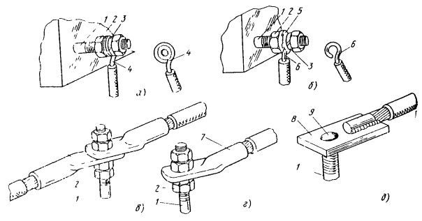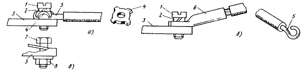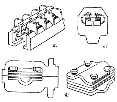 Контактные зажимы: 5.1.2. В распределительных устройствах, силовых цепях до 1000 В, вторичных цепях, при соединении проводов с установочными изделиями и в осветительных сетях применяют зажимы (наборные, ответвительные и др., рис. 5.2). 5.1.3. Контактные выводы и токопроводящие детали зажимов из меди, ее сплавов и стали должны иметь защитное металлическое покрытие. 5.1.4. Выводы должны быть укомплектованы крепежными изделиями, предусмотренными стандартами и техническими условиями на электротехнические устройства. По заказу потребителя при присоединении алюминиевых проводов и кабелей выводы должны быть укомплектованы средствами стабилизации контактного давления. 5.2. ИНСТРУМЕНТ И МАТЕРИАЛЫ5.2.1. Для выполнения соединений применяют ключи (гаечные, торцевые, разводные), напильники, слесарные молотки, малярные кисти, стальные щетки. Для растворителей, грунтовок и красок используют металлическую посуду. При выполнении сварных соединений пользуются инструментом, приспособлениями и материалами, указанными в "Инструкции по сварке цветных металлов в электромонтажном производстве" ВСП 369-76/ММСС СССР (М.: Энергия, 1978). 5.2.2. Для болтовых соединений применяют крепежные детали, перечисленные в табл. 5.1. Таблица 5.1