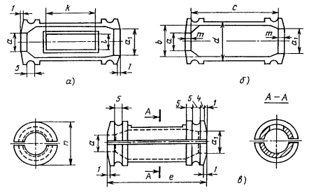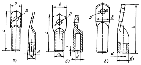 а - наконечники из трубки; б - из прутка; в - медно-алюминиевые Размеры наконечников см. в ГОСТ 9581-68. ПРИЛОЖЕНИЕ 6. ШТИФТОВЫЕ МЕДНО-АЛЮМИНИЕВЫЕ КАБЕЛЬНЫЕ НАКОНЕЧНИКИ ШП (ТУ 36-849-76)