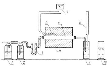 1 - склянка с 30 %-ным раствором щелочи; 2 - склянка с концентрированной серной кислотой  (плотностью - 1,84 г/см3); 3 - U-образная трубка с плавленным хлористым кальцием; 4 - трубчатая печь; 5 - термопара; 6 - фарфоровая трубка; 7 - милливольтметр; 8 - бюретка; 9 - поглотительная склянка; 10 - контрольный сосуд
