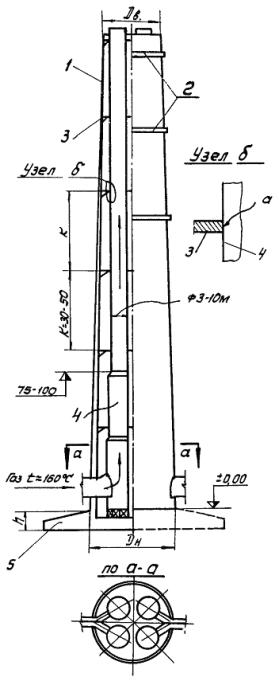 принимать с отношением Дн - наружный диаметр основания ствола (или его отдельных участков). 2.21. В многоствольных трубах (см. рис. 2) стальные стволы и металлоконструкции, расположенные внутри ж.б. ствола, учитываются только при определении масс отдельных их участков. Устойчивость самих стальных стволов проверяется по главе СНиП II-В.3-62 «Стальные конструкции. Нормы проектирования». При прогибах трубы от горизонтальных воздействий необходимо