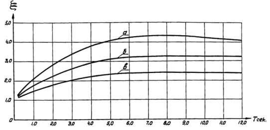 где Ra - принимается по табл. 5 приложения 1. sact - определяется по формуле (30), в которой величина xc определяется по формуле (31) при q = a. Значение xa вычисляется по формуле (32). Ширина раскрытия вертикальных трещин определяется по формулам (33, 34 и 38). 2.23. Расчет внутренней кольцевой арматуры производится на перепад температуры не менее 25°, аналогично расчету наружной кольцевой арматуры. Поверочный расчет на резонанс2.24. Для дымовых труб со слабой коничностью (не более 1,2 %) кроме расчета на скоростной напор ветра с учетом его порывов необходим также поверочный расчет на резонанс. Критическая скорость ветра, вызывающая резонансные колебания трубы в направлении, перпендикулярном ветровому потоку, определяется по формуле: В формуле (45): Т - период основного тона свободных колебаний трубы (сек); dв - наружный диаметр верхнего сечения трубы (м). Интенсивность аэродинамической силы F(x,t), действующей на трубу, определяется по формуле: F(x,t) = F(x)sin wt (46) где F(x) = F0a(x) - амплитуда аэродинамической силы, действующей на уровне с абсциссой «x»; a(x) - относительная ордината первой формы свободных колебаний; F0 = 0,02v2dв - амплитуда аэродинамической силы, соответствующая свободному концу сооружения (кг/м); 2.25. Резонансная амплитуда колебаний (yр(x) и изгибающий момент