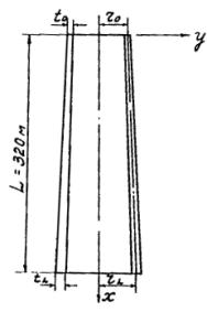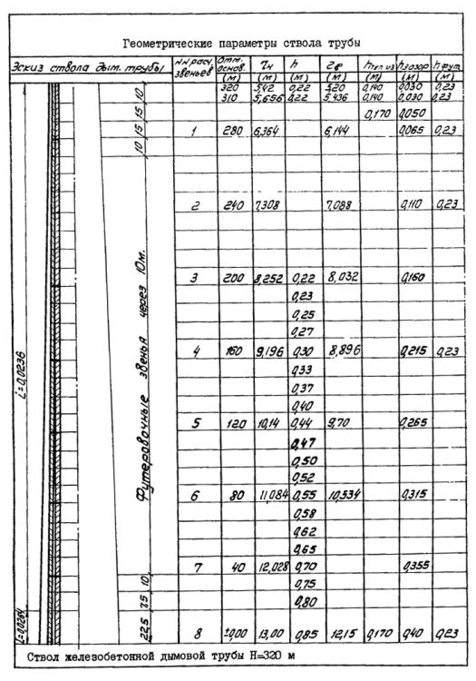 Примечания: 1. Значения Ra для расчета трубы даны с коэффициентом условий работы, равным 0,85. 2. В условиях воздействия температуры расчетные сопротивления арматуры умножаются на коэффициенты табл. 8 главы СНиП II-В.7-67. 3. При нагреве арматуры до температуры, превышающей 100 °С, расчетные сопротивления арматуры, указанной в табл. 5, умножаются на дополнительный коэффициент условия работы ma = 0,85. 4. Нагрев арматуры до температуры свыше 150 °С не допускается. Приложение 2Пример расчета ствола трубы1. Дано к расчету 1. Труба железобетонная высотой Н =320 м. 2. Внутренний диаметр устья трубы d0 = 9,6 м. 3. Температура отводимых газов t = 200°С. 4. Подводящий газоход - подземный. 5. К стволу непосредственно примыкает теплоизоляция толщиной 0,05 м с облицовкой кирпичной кладкой в 0,5 кирпича. 6. Футеровка трубы из кислотоупорного кирпича толщиной в 1 кирпич. 7. Между футеровкой и облицовкой имеется вентилируемый зазор переменной величины от 50 мм - вверху и до 400 мм внизу трубы. 8. Географический район строительства трубы - III. 2. Принято к расчету 1. Бетон для ствола марки - 300. 2. Уклон наружной грани оси трубы - i = 2,36 % 3. Труба разбивается на 8 расчетных звеньев с равным интервалом между сечениями - 40 м. 4. Арматура периодического профиля класса А-III