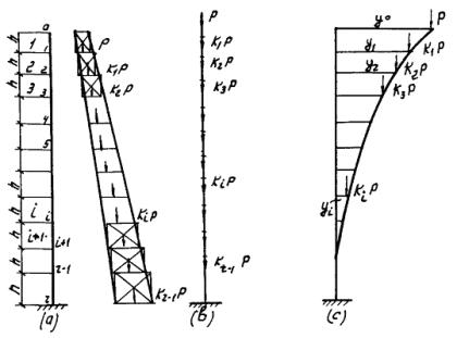 Момент инерции поперечного сечения при t < D = 2r I = p t r3. (64) Задача решается численным интегрированием. Для этого труба разбивается по длине на равные достаточно малые участки длиной В пределах каждого участка трубы толщина стенки принимается постоянной, равной полусумме толщин концов участка. Определяются нагрузки от собственного веса, пропорциональные Р - весу первого участка (полного кольца). (Р, k1Р, k2Р..., kiР..., k r-1P) Эти силы прикладываются на верхних концах каждого участка. Функция y(x) задается численно, причем I(x) = Iy(x) = 1y(x), то есть функция y(x) равна численным значениям моментов инерции в точках разбивки. Это означает, что кривая изменения моментов по высоте заменяется ломаной. Согласно рис. 9 (с) определяют значение функции М(х) в точках разбивки. Для этого предварительно задаются формой изогнутой оси трубы в виде параболической кривой с наибольшей ординатой вверху y0 = ymax= 1; M0 = 0; M1 = P(y0 - y1); M2 = [(y0 - y2) + k1(y1 - y2)] и так далее.