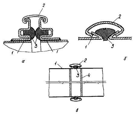 а - с применением шин; б - с применением реек по отбортованным концам воздуховодов; в - с помощью Z- и С-образных реек; 1 - воздуховод; 2 - соединительная рейка; 3 - резиновая уплотнительная прокладка Т-образной формы; 4 - густотертая краска Конструкция бесфланцевого соединения воздуховодов с иглоконусными фиксирующими элементами